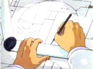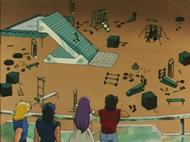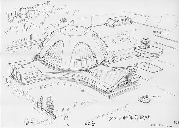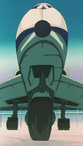 La puerta parece abrirse en uno de los parques de la ciudad, o al menos en una zona boscosa que separa el aeropuerto de la ciudad. La torre de control es octogonal, de cristal y cemento, con muchas antenas radar y, al parecer, de televisión. Junto a los edificios principales, son visibles hangares abiertos que normalmente sirven para guardar los aeroplanos de la Fundación que no están en uso. Este edificio no existe en el manga, donde los aviones parten directamente de una larga pista en el jardín de Villa de Kido. Objetos y vehículos