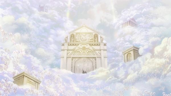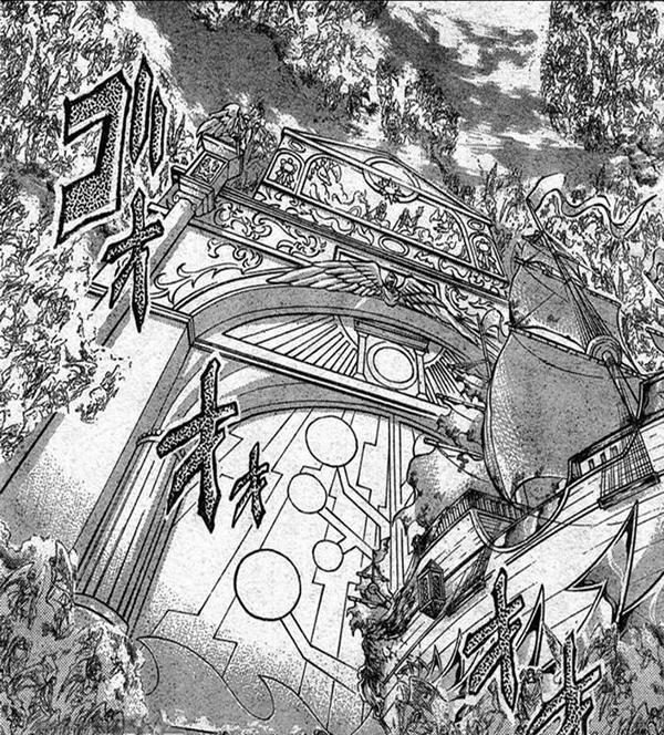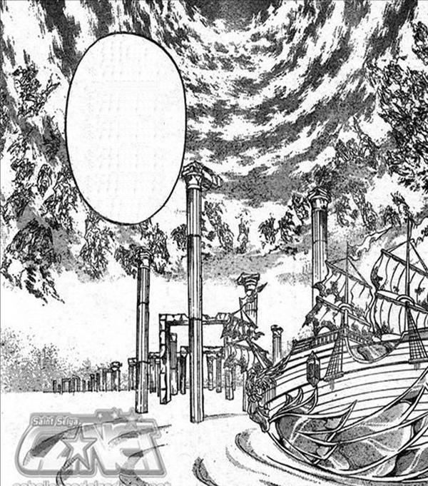 Mar de Nubes Tras cruzar la puerta, el barco de la esperanza navega por un espeso río del Lienzo Perdido formado por el agua de las nubes que es custodiado por el espectro Caronte de Aqueronte. En este lugar el ejército de Saints de Atenea es petrificado, únicamente sobreviven Tenma, Sasha, Regulus y Shion. En este lugar Caronte y Alone sellan los poderes de Sasha en una pintura, volviendo a Sasha completamente humana. Este lugar tiene un cierto parecido con Skypia del manga-anime One Piece, ¿no les parece?. •