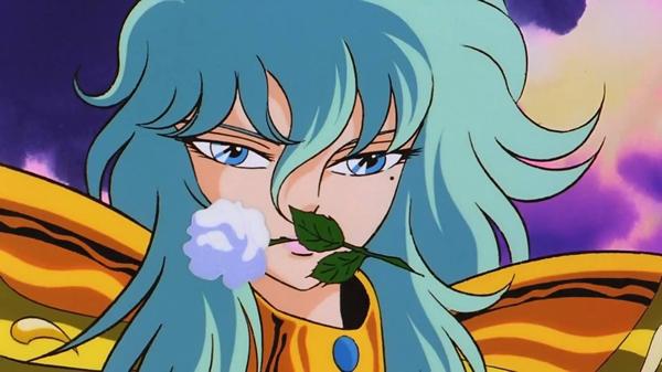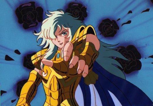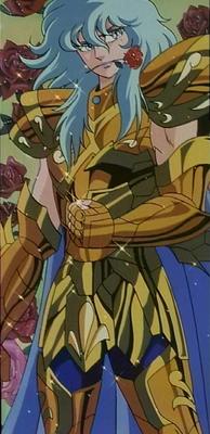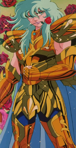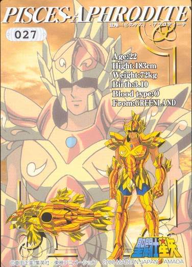 DIFERENCIAS MANGA Y ANIME Cabe señalar que en la versión manga (Capítulo 41) Aphrodite es enviado por el Pontífice a la isla Andrómeda, siendo él quien asesina a Daedalos en combate singular, de una forma un poco más leal, a diferencia de la versión animada, donde es Milo de Escorpión quien desafía a Daedalos (Albior) y Aphrodite lo asesina a traición por la espalda aprovechando que está distraído en su combate. Además, en el manga el Gold Saint de Piscis dedica palabras respetuosas hacia el maestro de Shun y reconoce su poder. El castigo a Daidalos se debía a que no había atendido las llamadas del Pontífice desde hacía tiempo, aparentemente este sospechaba que algo estaba mal en el Santuario. Este es un ejemplo, entre otros, de los cambios realizados en el anime en la personalidad de Afrodita, que ha ayudado, sin duda, a hacerlo más antipático / desagradable a los ojos de los fans. SAGA DEL SANTUARIO Cuando el Pontífice Saga se refiere a él lo describe como un asesino sin piedad que se dará un placer en eliminar a Seiya y Shun, también nos dice que es el caballero más bello de la orden. Durante su presentación oficial muchos fans dudaron inicialmente entre si era una mujer o un hombre, así por ejemplo, en la versión francesa del Anime tenia voz de chica, hecho estúpido pues no lleva máscara y que llevó a más confusión.. aunque para ser masculino es un personaje bastante afeminado con sus labios a juego con el color azur de sus largos cabellos ondulados (sería una imagen ideal para el anuncio de Loreal “porque yo lo valgo”). Sin duda es el más bello de los 88 caballeros (con el permiso de Misty de Lagarto) y por tanto de los 12 dorados, aunque un poco loco. Junto al Pontífice-Saga, es el único caballero de oro que ideó una trampa para detener a los caballeros de bronce, creó un jardín enorme repleto de Rosas Rojas somníferas para evitar que Seiya y Shun llegaran al templo del Pontífice, ese poder no importo que el caballero estuviera muerto puesto que aun después de morir las Rosas Rojas seguían causando efecto sobre Seiya que se había adelantado para llegar al Templo del Pontífice. Durante la batalla de las 12 casas, será el último obstáculo entre los caballeros de bronce y el Gran Pope. Shun se enfrentara a él. Durante el combate, Afrodita informará a su adversario que Milo de Escorpión no fue el verdadero responsable de la muerte de Albiore de Cefeo, su maestro. En realidad, el Pope, conociendo el poder de Albiore, prefiere enviar un segundo caballero de oro para ayudar a Milo a eliminar el caballero de Cefeo y destruir la Isla de Andrómeda.