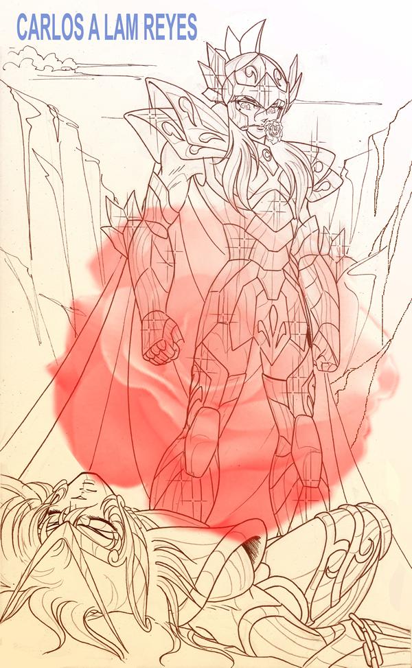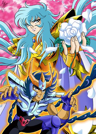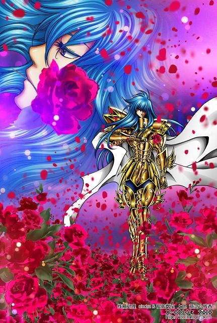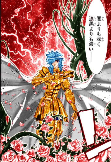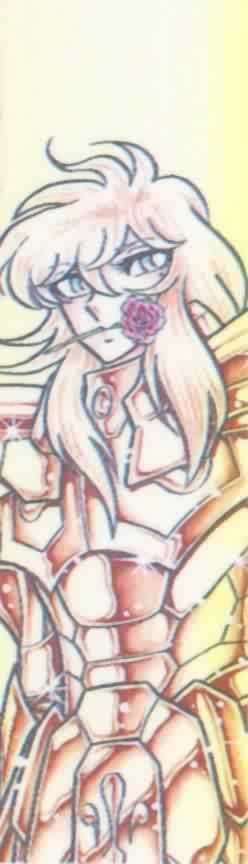 Fanart de Carlos Alberto Lam Reyes (Perú) Posee sangre mortalmente venenosa y una bella apariencia. Es quien se encuentra esperando a Minos de Grifo y todo su grupo de specters subordinados cuando estos intentan invadir el Santuario, el Santo de Piscis detuvo él solo la invasión, preparó una trampa cubierta de rosas entre la aldea de Rodorio y las inmediaciones del Santuario para impedir que ningún specter avanzara, esperando la llegada de sus enemigos sentado en un pilar en ruinas. Se encarga de eliminarlos a todos con sus rosas diabólicas, que no le afectan al ser inmune a su veneno, absorbió la fragancia venenosa del Specter Niobe de Deep de las tropas de Radamanthys, un rival con métodos de batalla similares, para evitar que se expandiera y luego lo eliminó con su propia sangre. Mantuvo a continuación un duelo contra el juez Minos, pero todas las técnicas de Albafica resultan inútiles y Minos tomó ventaja y lo apresó con los hilos de su técnica especial "Cosmic Marionettion" jugando con él sádicamente como si fuera una bella marioneta, hasta romper todos los huesos de su cuerpo, Minos logra presuntamente matarlo para luego ir a destruir el pueblo que este defendía, entonces interviene Shion de Aries. Luego se da a conocer que el Santo de Piscis no fue vencido y se dispone a seguir peleando con su enemigo. Ambos Gold Saints no parecen lo suficientemente fuertes como para derrotar a Minos, no obstante, en el último asalto Minos baja la guardia y Albafica combina su técnica "Crimson Thorn" y su “Bloody rose”, engañándolo al usar la Bloddy Rose como las Royal Demon Rose, y logra clavar una rosa blanca en el cuello de Minos que absorbe su sangre. Irritado ante su inminente muerte por culpa del fluido venenoso de una flor, Minos intenta arrasar el pueblo y los habitantes de Rodrio con su "Gigantic Feathers Flap", pero Shion avita que cause desperfectos creando una barrera deflectora usando su "Crystal Wall", hasta que Minos muere. Albafica tiene derecho a un Gaiden propio. En el audio drama "Albafika Gaiden - Akai Kizuna" (La Historia Paralela de Albafika - Red Roja), publicado en forma de CD especial el día 28 de julio 2010, narra una historia paralela escrita por Shiori Teshirogi en la que se revelan datos acerca del Gold Saint de Piscis. El Pontífice Sage detecta la presencia de una estrella maléfica perteneciente a un Specter de Hades cerca de la “Isla de los Curanderos”, un lugar cercano muy útil al Santuario y las regiones vecinas donde sus habitantes utilizan técnicas y hierbas para curar todo tipo de heridas y dolencias… Albafica recibe la misión de desplazarse para investigar. Durante la narración del CD Drama se exponen escenas retrospectivas que explican como Albafica fue encontrado cuando aún era un bebe por su maestro, Lugonis, el precedente Gold Saint de Piscis en un jardín de rosas venenosas cultivado por este en las 12 casas, a pesar de la fragancia venenosa el bebe no murió, hecho que le sorprendió por su fuerza de vida y su habilidad de resistir al veneno, apreciando que Albafica era amado por las rosas venenosas. Lugonis se hizo cargo del retoño y lo entrenó, casi a diario ambos mezclaban su sangre, que había absorbido y se había vuelto inmune al veneno de las rosas, hasta que un día la sangre de Albafica se volvió más venenosa que la de Lugonis, y provocó su muerte. Revelándose el destino de Piscis, aquel con la sangre más venenosa sobreviviría para seguir el camino de la batalla. Albafica demostró tener una habilidad natural para resistir el veneno y ser amado por las rosas. Su destino es vivir apartado de los demás para no matarlos con su contacto y sufrir solitud, incluso las lágrimas que vierte al recordar a su maestro son venenosas, por ello no permite que nadie se le acerque, circunstancia que contraria a Sion de Aries, que lo aprecia y pretende ser su amigo. El Gaiden presenta igualmente al Specter Luco de Dryads, de la Estrella Celeste de la Ascensión, que se enfrenta a Albafica, este tiene una técnica denominada EARTH OF THE LILY (Tierra de los Lírios) que utiliza minúsculos y lindos lirios blancos, pero aun así no logra librarse y perece por el veneno de las Demon Rose rojas de Albafica. Colorización de X-Color (China) Los Lazos rojos El término Lazos rojos designa al ritual de sangre entre un Gold Saint de Piscis y su pupilo. Ambos intercambian regularmente una gota de sangre de una herida hecha en la punta de los dedos de cada uno de ellos, la sangre transmitida circulará en los cuerpos de cada uno durante algunos años, aquel que reciba y no resista la sangre envenenada de Piscis tendrá una muerte terrible. Incluso, si uno de los dos soporta la sangre envenenada, le espera una vida solitaria. Su vida se teñirá de rojo profundo igual que el veneno. Albafica realiza durante años este ritual / ceremonia con su maestro Lugonis, renunciando así a una vida normal. Al principio, el veneno de la sangre de su maestro sólo le quemaba el cuerpo y le causaba dolor, pero en varias ocasiones estuvo al borde de la muerte, errante, aunque logró sobrevivir en cada ocasión. Pronto su cuerpo se fue acostumbrando a ese veneno. Lugonis y Albafica compartían el mismo veneno en su sangre, haciéndolos cada vez más cercanos en el mundo, más que un padre e hijo según decía el propio Saint. Albafica por momentos pensaba que se trataba de algo estúpido, sin embargo, en un intercambio de sangre Lugonis cayó muerto. Antes de irse, le dijo a Albafica que finalmente el veneno del alumno había superado a la sangre del maestro, tanto que fue capaz de matarlo, y le explica el destino de Piscis: "Esta Ceremonia en que aquel que posea el veneno y la mayor toxicidad en su cuerpo a través del proceso de circulación de la sangre, por ley sobrevivirá y seguirá por el camino de las batallas. De una u otra forma terminará muerto." Comparativo