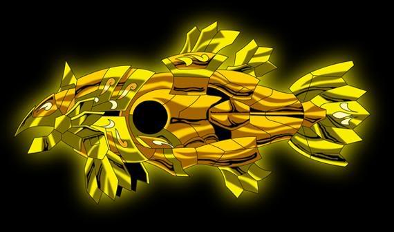 Fanart de Trident (Francia) La Cloth en forma Object El tótem de esta armadura representa un solo pez, por lo que difiere del símbolo tradicional de dos peces atados por una cinta. Las piezas son bastante compactas, y se unen entre sí de forma que se hace difícil distinguirlas, pero vemos que el casco forma la cabeza del pez y en su interior encaja el bloque central, que diseña el cuerpo entero, con el cinturón que forma la cola. Las hombreras forman el cuello, mientras que una parte de un brazalete y parte de una rodillera se ajustan para formar las aletas dorsales. El otro brazalete, la rodillera y parte de la visera del casco forman las aletas ventrales. Acoplamiento El procedimiento de endosamiento de esta armadura no se muestra nunca en la serie.