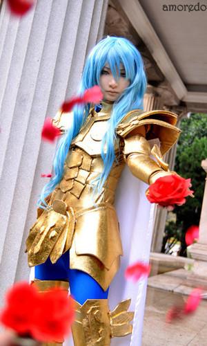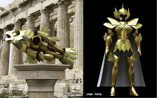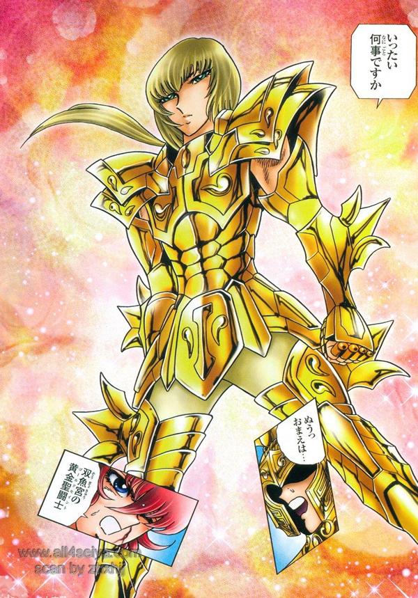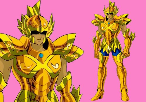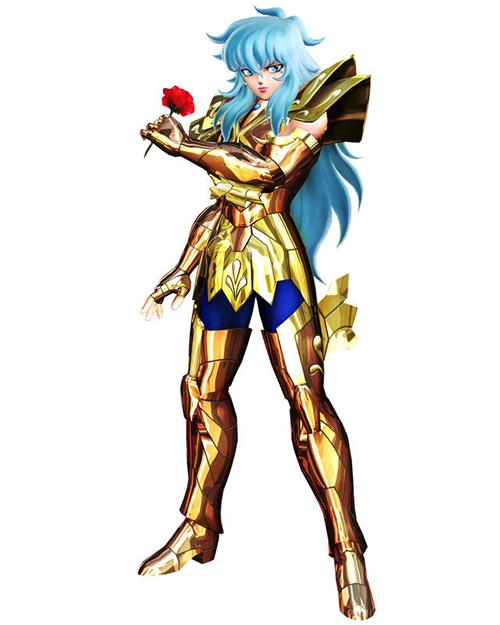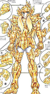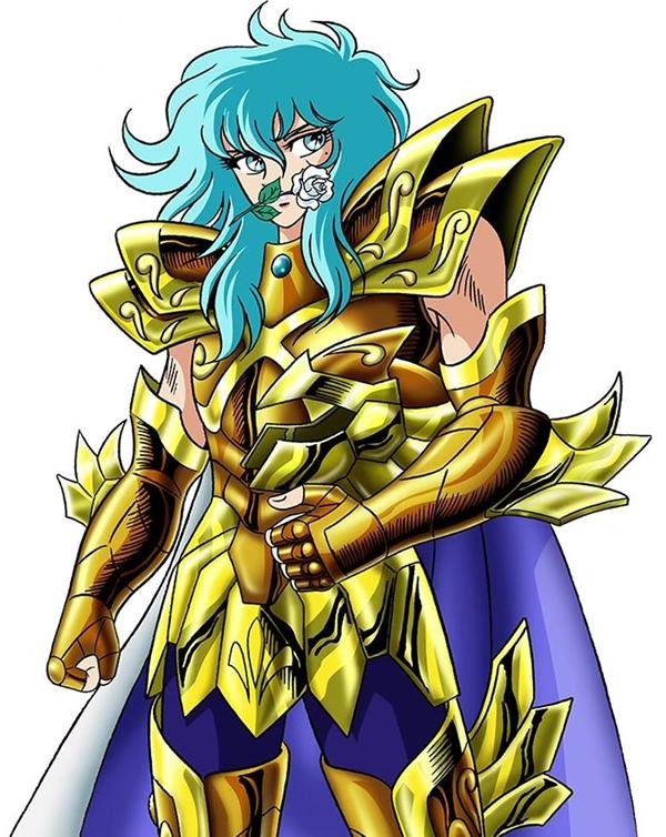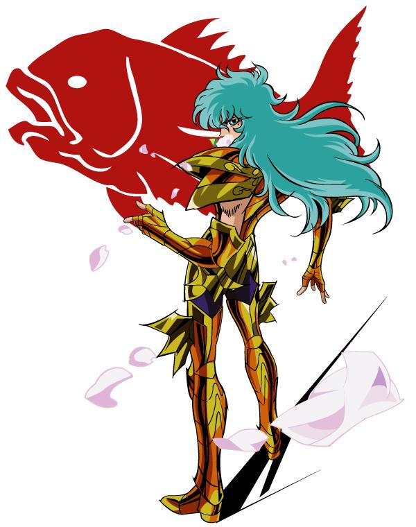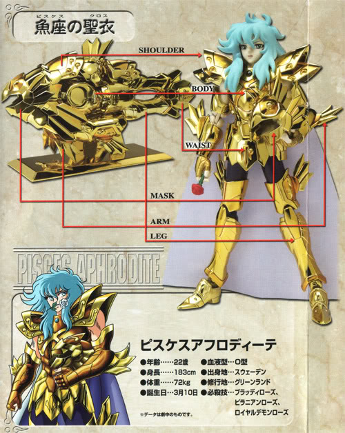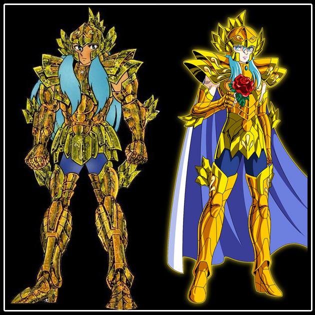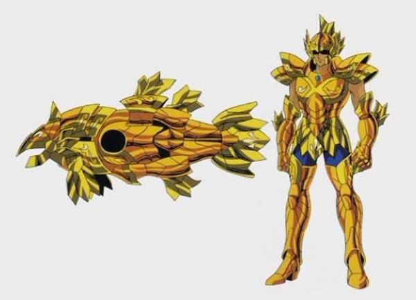 Particularidades de la armadura: Es un ropaje cautivador y muy bello, con formas graciosas y calurosas que evocan / insinúan el carácter “acuático” y “marino” del signo de Piscis. Curvas generosas y escamas majestuosas decoran el magnífico casco, los codos y la parte alta de las piernas del Gold Saint. Las hombreras son dobles. Aunque conservando su aspecto general, la armadura de oro sufrió numerosos cambios menores en su paso a anime. El casco parece haber sido conservado perfectamente, lo que no es el caso de las hombreras cuyas extremidades han sido un tanto redondeadas y curvadas. Las placas en forma de escamas del busto parecen haberse fusionado al busto y presentan un diseño más liso. Los brazaletes de la armadura se vuelven mucho más simples y redondeados. El contorno de los antebrazos se vuelve también más liso y la especie de aleta decorativa cambia un tanto de aspecto. La doble falda desaparece en favor de una falda única pero que conserva un determinado grado de complejidad. Las musleras cambian completamente de diseño y pierden las aletas decorativas. Las perneras se simplifican al extremo y pierden toda oblicuidad.