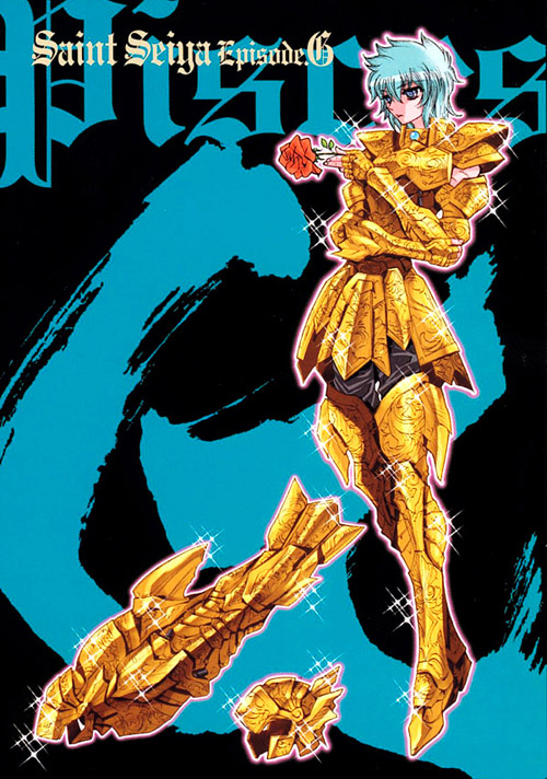 Episodio G En el Episodio G, la armadura de Piscis, sin dejar de ser fiel a la apariencia clásica, ha sido modificada de una forma más pronunciada y evidente. En primer lugar se han añadido un montón de decoraciones en relieve en prácticamente todas las piezas, que representan la espuma, varias flores y volutas, pero también se han eliminado prácticamente todas las aletas, excepto en las rodilleras y el casco, mientras que las de los brazaletes se han hecho más pequeñas, planas e inclinadas hacia abajo. El collar ha sido alzado, la parte inferior de las hombreras ha sido doblada hacia abajo para proteger mejor el brazo y se han ampliado los protectores de los bíceps hasta el punto de que sólo una pequeña parte de la extremidad, la parte superior del húmero, queda al descubierto. El pectoral ha sido reducido, y las protecciones del abdomen han sido dispuestas en varias capas, formando placas que se deslizan una por debajo de otra cuando el Gold Saint se agacha. La cintura se ha ampliado, las espinilleras son más homogéneas y las hebillas de los zapatos se han reducido. También se cambió el tótem, que es ahora un poco más aerodinámico y cuenta con una sola aleta en la espalda. Cabe señalar finalmente que en el Episodio G la armadura suele cambiar los detalles de una página a otra o de una viñeta a otra, especialmente a nivel de ornamentación.