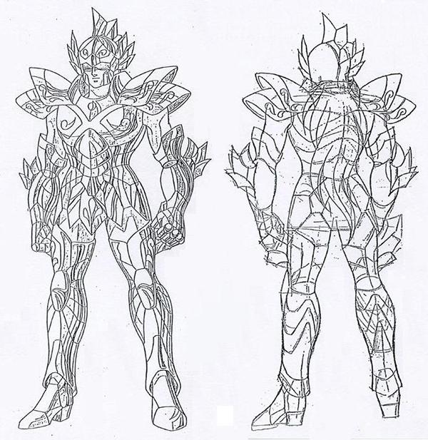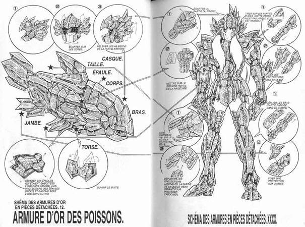 Manga clásico La armadura de Piscis aparece en el manga clásico y en las tres precuelas: Next Dimension, Episodio G y Lost Canvas. En el manga clásico tiene formas sustancialmente similares, pero con muchas pequeñas diferencias y un aspecto un poco más tosco. Los protectores de los bíceps son más grandes y tienen una forma de embudo, el abdomen está más esculpido y es más estético, y sobre los brazaletes se apoya una placa casi horizontal, a modo de escudo, de la que parten aletas. Una placa similar está conectada a las rodilleras, cuya parte interior está en espiral y dividida en niveles encajados unos sobre otros. El borde inferior de la cintura es más geométrico y parece que hay una aleta encajada en la coraza dorsal. Se han añadido placas en el dorso de los pies, similares a visores, y las espinilleras son considerablemente más grandes y geométricas. En los esquemas técnicos un box confirma que pectoral y cintura son una sola pieza. Esta forma de armadura es básicamente la que aparece, con formas más cónicas, en los mangas Next Dimension y The Lost Canvas. En comparación con el manga clásico, ambas precuelas han esculpido y hecho más relevante el abdomen. The Lost Canvas también ha ampliado la cintura y trasladado las aletas de los brazaletes a los lados, al igual que en el anime, en vez de mantenerlos en el centro.