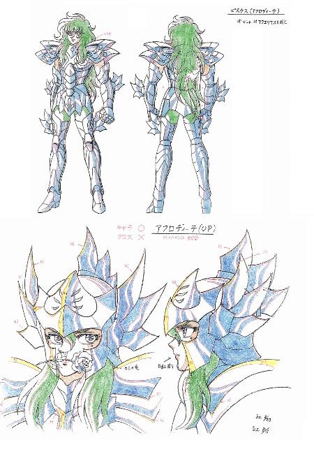 Anime Es una de las más hermosas Gold Cloths, Kurumada dibujaba las Scales de los Marina de una forma similar, con placas en forma de escamas. Aun con su complejo diseño en el manga, sobrevivió virtualmente intacta en el anime. El casco es igual al manga. Hubo una reducción de los ornamentos, como en todos los otros casos, pero el peto, las hombreras y los protectores de brazos son iguales al manga, sólo ligeramente más sencillos. Los protectores de las piernas son iguales, siempre más sencillos. Las rodilleras son más largas en el manga, en el anime son más cortas y más redondeadas. Los zapatos tienen forma más anatómica en el anime, y son más sencillos. Un excelente trabajo en el anime, considerando que su complejo diseño en el manga la hacía difícil de animar. En el manga Aphrodite es rubio. Sus ropas son blancas bajo la Pisces Gold Cloth. En el anime, su cabello es celeste, y sus ropas azul púrpura. Me gusta mucho el color de su cabello y su ropa en el anime. La gema en el peto de la Cloth es del mismo color que la Cloth en el manga, en el anime es celeste.