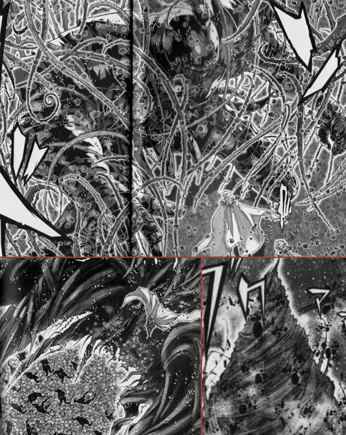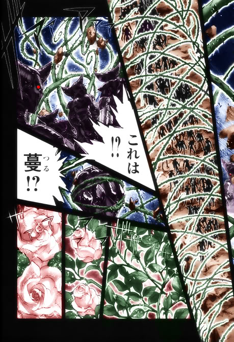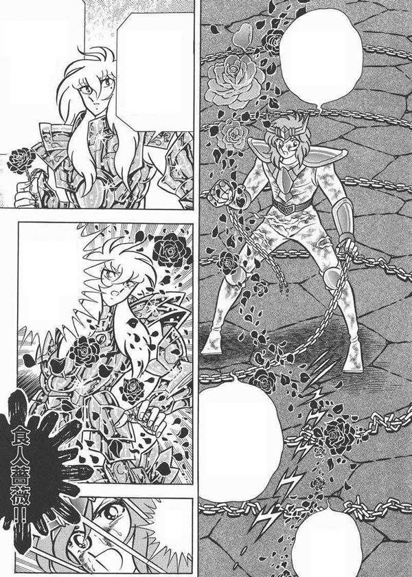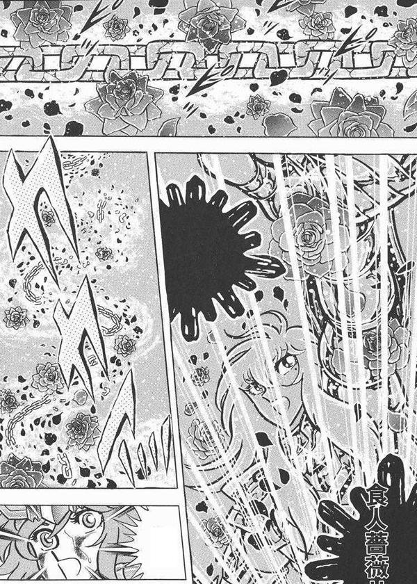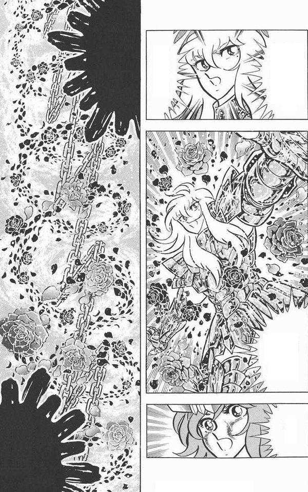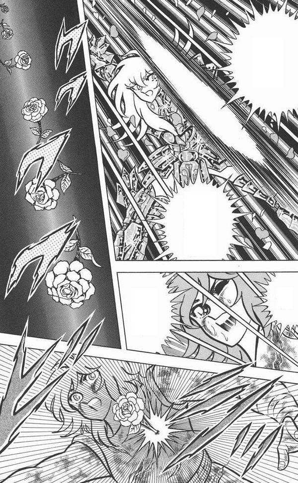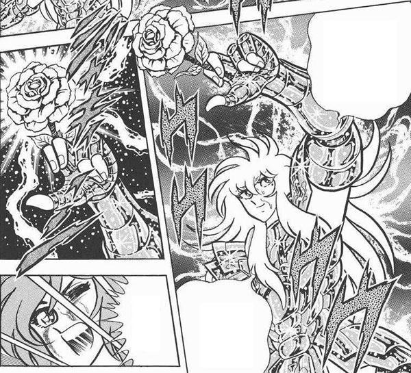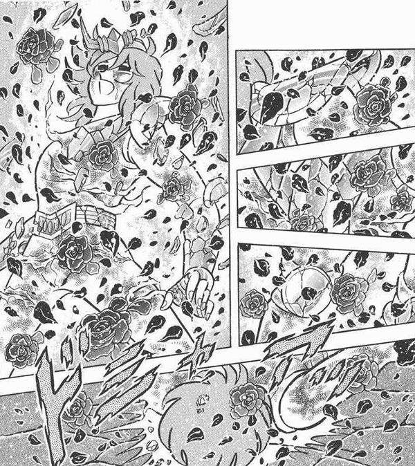 En el manga precuela Saint Seiya Episodio G, se muestra como Aphrodite es capaz de crear y manipular enormes raíces de rosales de maneras diferentes: para sujetar fuertemente, estrangular y frenar los movimientos de un gigante (parte superior), como láminas gigantes (parte inferior izquierda) y como capullo protector o medio de curación del cuerpo de una persona a través de su energía cósmica (parte inferior derecha).