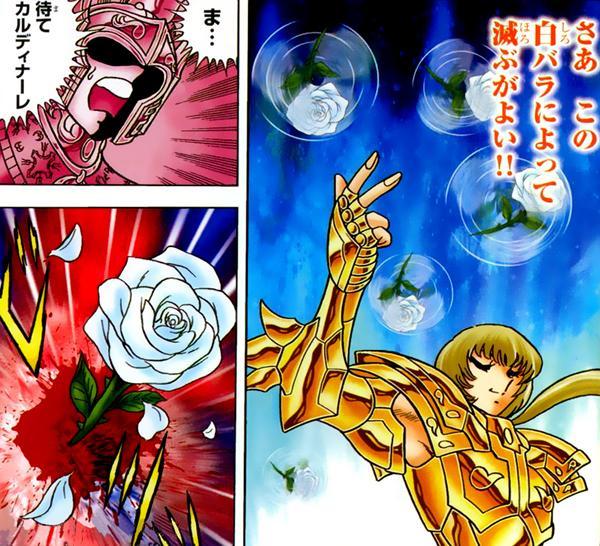 felicitación Sus principales habilidades son las rosas (en conexión con Afrodita la diosa griega de la belleza), las utiliza para ataque, defensa o camuflaje. Las Rosas Negras que destruyen todo lo que esté en su camino, las Rosas Rojas que adormecen y paralizan al oponente con su polen y la Rosa Blanca que es mortal (decididamente es un caballero que no necesita ir a la Floristería a comprar). A algunos fans les sorprende el hecho que todo su poder se base en las rosas, se ha sugerido que en vez de usar flores el caballero del signo de Piscis debería haber sido un maestro del elemento líquido, capaz de utilizar la humedad del ambiente para atacar con trombas de agua. De todos modos este detalle lo haría demasiado similar a su vecino Camus de Acuario. Como veis, hay opiniones para todos los gustos.