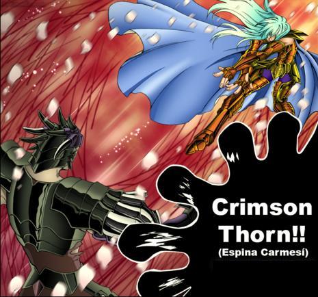 · CRIMSON THORN = "Espina Púrpura o Carmesí" Técnica ofensiva exclusiva del caballero de oro Albafica de Piscis en el manga The Lost Canvas (capítulos 3, 17 y ss.). Cuando es herido, Albafica manipula la sangre envenenada de su propio cuerpo, altamente tóxica, para formar una niebla púrpura y luego dirigir el centenar de gotas suspendidas de su sangre para formar una multitud de finas agujas y bombardear a su oponente con una lluvia de proyectiles similares a flechas a la velocidad de la luz. A veces se salta la etapa de la niebla y va directamente a disparar las agujas de sangre. Cualquier persona que sea atravesada por estas muere en cuestión de segundos al estar su sangre impregnada del veneno concentrado de sus rosas. Es un ataque que asegura el exterminio del enemigo a causa del veneno si las espinas carmesí llegan a tener contacto con su cuerpo. Es casi tan efectiva como la Rosa blanca sangrienta. Este ataque no parece tener una fuente de inspiración aparte del manga, salvo que algunas sociedades utilizan, de manera similar, dardos envenenados como armas, tales como los ninjas en Japón o las tribus aborígenes de Brasil. La sangre venenosa y mortal de Albafica, difundida y vaporizada por el aire con la apariencia de niebla, toma la forma de una multitud de espinas o agujas que atraviesan a su adversario, que es envenenado directamente en una dosis muy alta. Una vez que la sangre de Albafica se inyecta en el torrente sanguíneo de su víctima, esta muere en cuestión de segundos. El poder de penetración es lo suficiente como para perforar la Surplice del Niobe de Deep y matarlo, pero no pasa a través de las alas del Surplice del Grifo. Minos fue infectado por esta sangre a través de una Bloody Rose que Albafica alimentó con su propia sangre. Durante su lucha contra Niobe, Albafica no lanza directamente el Crimson Thorn, pero deja que la sangre de sus heridas cree una nube de sangre a su alrededor antes de usar su técnica. Con esta técnica Albafica acabará con el espectro Niobe, aunque será en cambio ineficaz contra Minos, que se protege con sus alas. Pero el caballero de Piscis la utilizará a pesar de todo, como un medio de distracción, para clavar su Rosa Sanguinaria en el corazón del Juez. Un ataque suicida que le saldrá bien y que lo vaciará desgraciadamente de su sangre, sellando así su destino.
