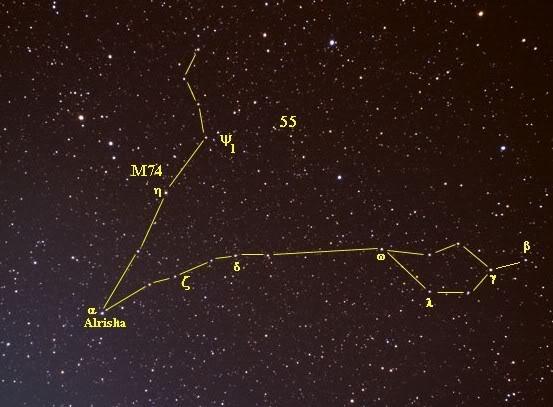 Es una gran constelación del zodíaco, pero de un interés limitado, formada por una cadena de estrellas débiles ligeramente más brillantes que las de cuarta magnitud. Esta constelación está marcada por un círculo de estrellas al sur del gran cuadro de Pegaso, es la parte más fácil de identificar. Piscis, se trata de una gran constelación débiles en estrellas y difícil de detectar a simple vista, únicamente visible en noches transparentes y lejos de las luces de las ciudades. Es una constelación ecuatorial y por tanto visible en todo el planeta durante más de seis meses entre Julio y Diciembre, durante más de treinta días el Sol permanece en ella, por tanto la eclíptica o línea aparente del movimiento del Sol a través de las constelaciones cruza la constelación de este a oeste, por tanto, durante unos meses podemos observar siempre algún planeta o la misma Luna cruzándola de este a oeste. Forma parte del signo zodiacal y actualmente, por la precesión de los equinoccios se halla el punto vernal que indica la posición del Sol cuando se inicia la primavera en el hemisferio norte o corta la eclíptica de sur a norte, hace más de dos mil años el punto vernal se hallaba en la constelación de Aries.