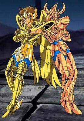 Las rodilleras reemprenden la forma de los protectores de los bíceps. Se trata de piezas que parten de la rodilla y llegan más o menos a mitad de la pierna. El borde superior es triangular, para que se extiendan más arriba en el centro que en los laterales. Como los protectores de los bíceps también son dobles, se trata de dos placas superpuestas que se superponen en la parte delantera del muslo, la más alta tiende hacia la cintura y la más baja acaba bajo la protección de la rótula, que forma parte de las espinilleras. El resto de la pieza es cilíndrica y rodea la base del muslo en una forma bastante uniforme por los cuatro lados. La parte posterior de la rodilla está cubierta de metal delgado y flexible para permitir que el Gold Saint doble la pierna por completo. Las rodilleras son completamente doradas. Las espinilleras cubren toda la pierna, desde la punta de los dedos hasta la rodilla, ya sea por delante como por detrás. El mismo pie también está cubierto bajo la planta, el tobillo y el talón. Ampliados en correspondencia con la pantorrilla, las espinilleras del borde superior se superponen a las rodilleras. Las decoraciones en los laterales hacen hincapié en la forma de los músculos de la pierna, mientras que a la altura del tobillo hay articulaciones, que probablemente unen la protección de la pierna a la del pie para permitir que el Gold Saint se mueva libremente. El calzado también se desliza en el interior de la espinillera, casi como una bota. En la rótula hay una protección hexagonal para la rodilla, particularmente reforzada y de varios centímetros de espesor. El borde inferior se desliza bajo el resto de las espinilleras, y en la parte de atrás parten delgadas láminas de metal que cubren la parte posterior de la articulación. La protección para el pie no está adherida, forma un zapato real, con un tacón en el talón. El tobillo está cubierto con una pieza similar a la que protege el codo, una especie de visera, con articulaciones de ambos lados para llegar hasta la tibia cuando el Gold Saint dobla el tobillo y baja sobre el pie en condiciones normales. En el exterior, el borde de esta protección forma una aleta de oro similar a las de la armadura de oro de Pegaso, en ángulo hacia arriba y de una longitud de varios centímetros. Esta ala tiene sólo una finalidad ornamental, y termina en punta, más o menos a la altura de la pantorrilla. El resto de las espinilleras está cubierto de dibujos frisos con motivos en S y son totalmente de oro.
