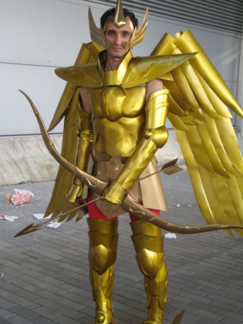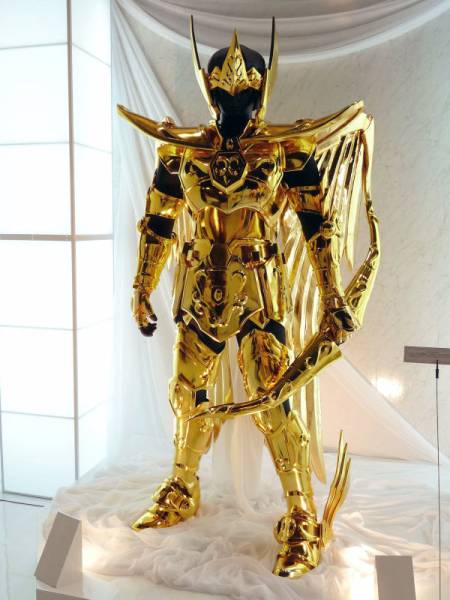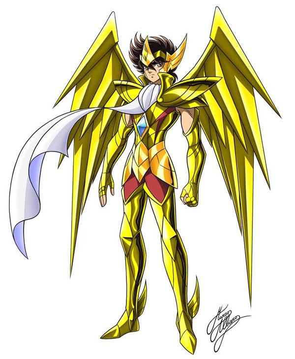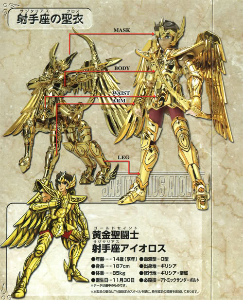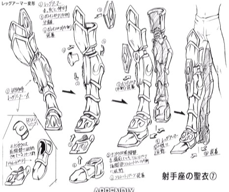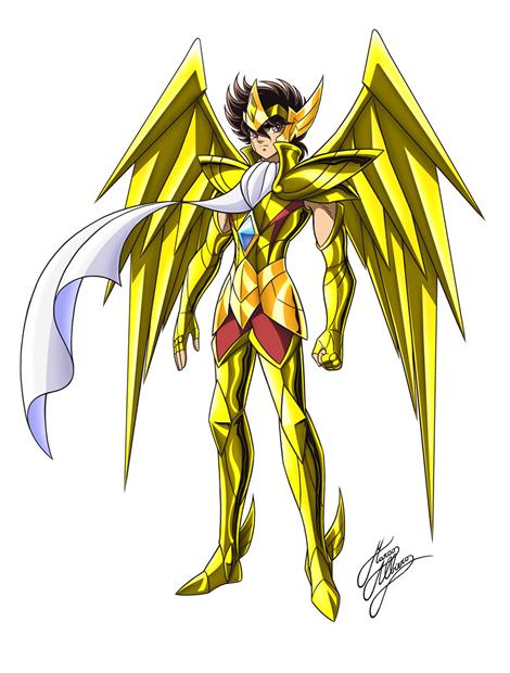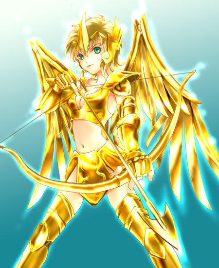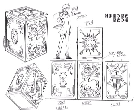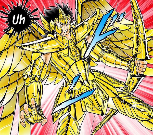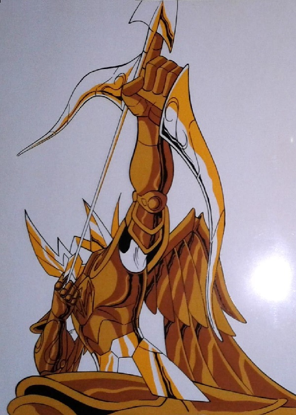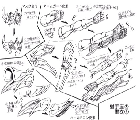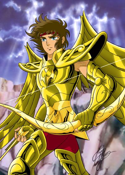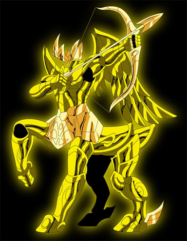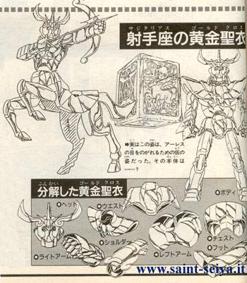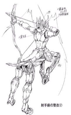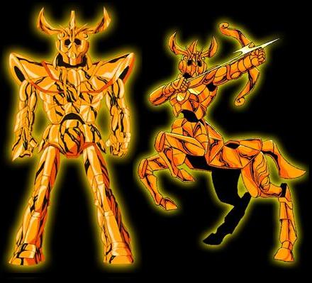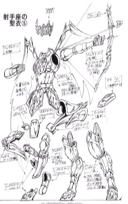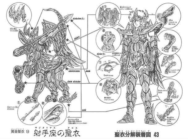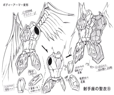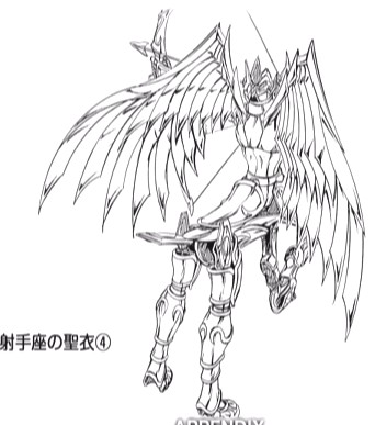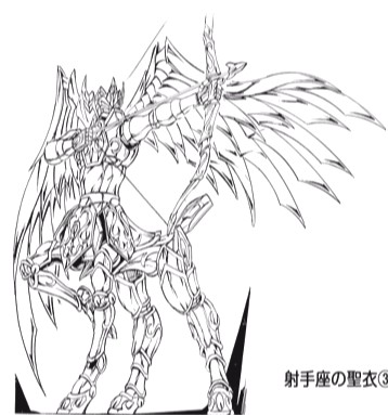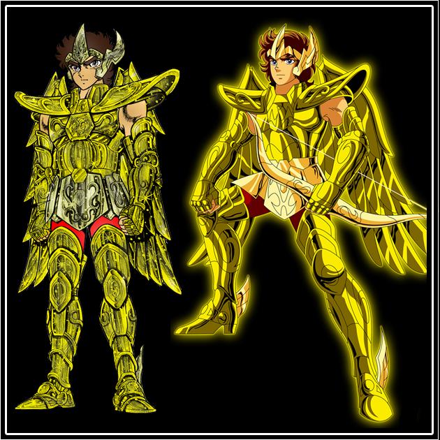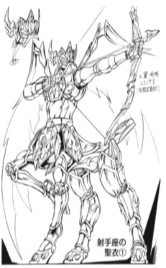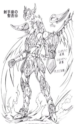 Fanart de Jerome Alquie (Francia) La Sagittarius Gold Cloth es una de las más hermosas Gold Cloths, debía ser adaptada al anime lo más fiel al manga que se pudiera debido a su importancia en la trama. Y así fue. Hay pocas modificaciones, casi sólo en lo que respecta a ornamentos. El mask en el manga tiene pequeñas decoraciones en la flecha y en los bordes, estos fueron removidos en el anime para facilitar la animación. El ornamento de las hombreras es igual sólo que orientado al lado contrario en el anime. Las subhombreras aparecen también en el anime. Los pequeños ornamentos del pecho en el manga fueron removidos en el anime, lo cual fue buena idea pues en el manga parecen ganchos. La placa abdominal del anime está más moldeada y más anatómica, en el manga más parece panza. Los protectores de los brazos sobrevivieron intactos en el anime aun con su complicado diseño en el manga, y los de la cadera también, sólo teniendo ornamentos más sencillos. Las botas también son iguales, ligeramente menos ornamentadas y sencillas, pero aun los zapatos son iguales, sólo que más anatómicos. Las alas, que tienen un diseño algo complejo en el manga, se adaptaron intactas al anime.