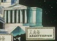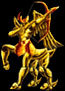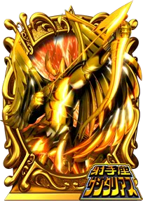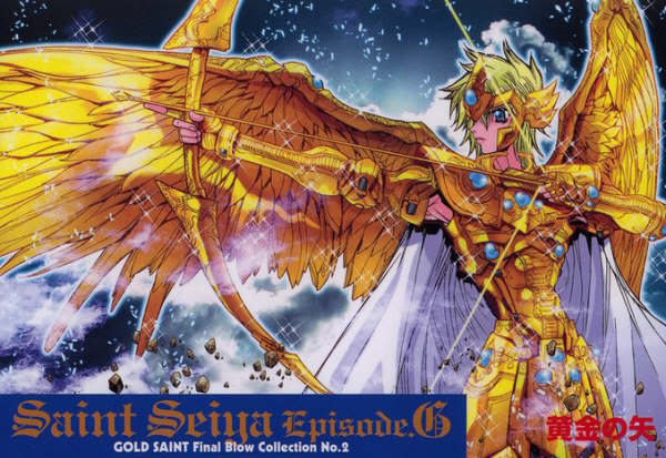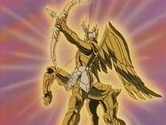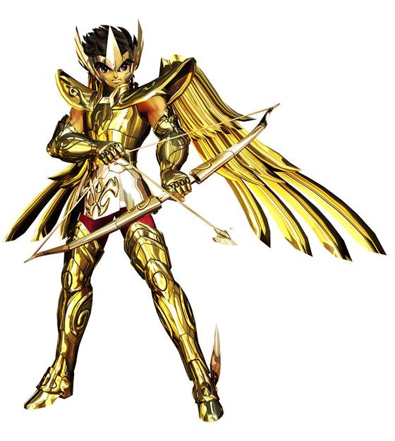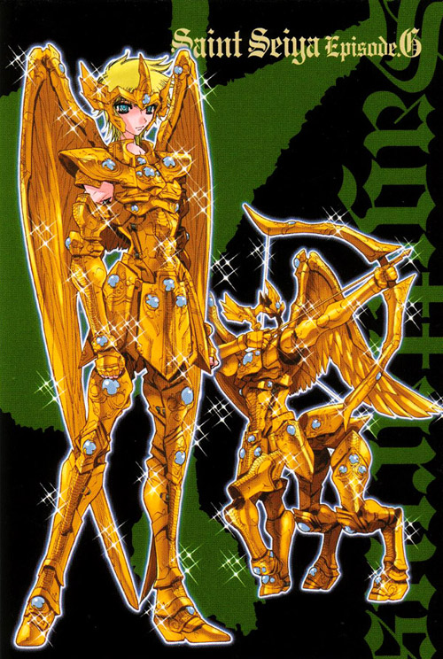Episodio G En el Episodio G, la armadura de Sagitario, sin dejar de ser fiel a su apariencia clásica, ha sido modificada de una forma más pronunciada y obvia. En primer lugar se han añadido un montón de decoraciones en relieve en prácticamente todas las piezas, que representan las habituales medias lunas y también varias flores y volutas. Han sido añadidas numerosas, por lo menos 22, gemas azules esféricas, con incrustaciones en oro, a veces solas y a veces en grupos de dos o tres. No sabemos lo que representan o si son sólo un capricho estético, pero las joyas literalmente bombardean la armadura, están fijadas gracias clips pequeños que cubren los bordes. Además, las alas se han alargado, ahora llegan a los tobillos del Gold Saint, pero al mismo tiempo se han cerrado con el fin de acabar con la división en niveles o capas y flecos, convirtiéndolas en un estrato de plumas numerosas pero pequeñas, similares a las de los pájaros de verdad. Aparte de eso, se han ampliado las rodilleras y los protectores de los bíceps, y se han restringido notablemente las hombreras. Las alas de la tiara tienen bordes dentados y el cuello forma una especie de anillo frente a la garganta. La protección para el abdomen y el pecho ha sido rediseñada en una serie de platos cuadrados colocados en varias capas para deslizarse unos debajo de otros y permitir que el Gold Saint se agache. La cintura se ha ampliado, y se han eliminado las aletas en los tobillos, de las cuales sólo quedan en las hebillas en los zapatos. La flecha de oro tiene una punta un poco más pequeña y un asta más delgada. Teniendo en cuenta estos cambios, el tótem se ha mantenido más o menos igual. Cabe señalar finalmente que en el Episodio G la armadura suele cambiar los detalles de una página a otra o de una viñeta a otra, especialmente a nivel de ornamentación.