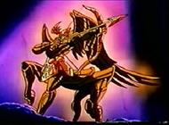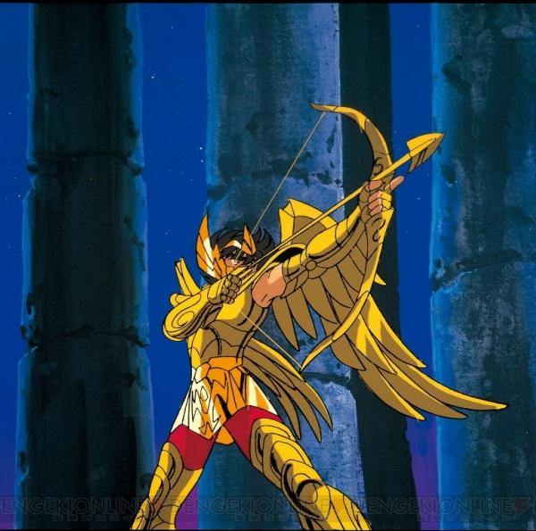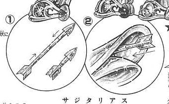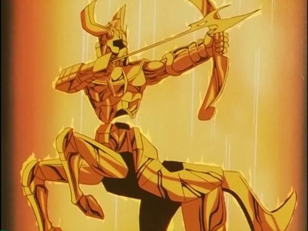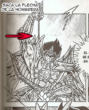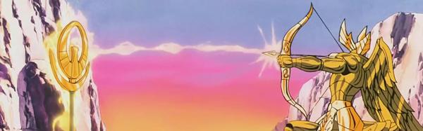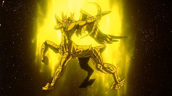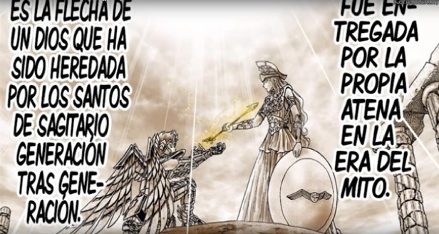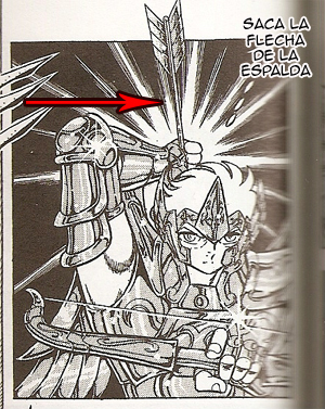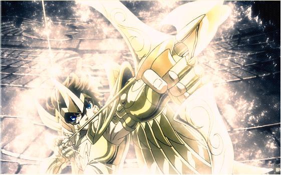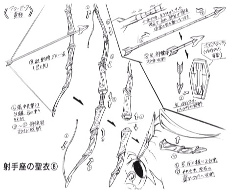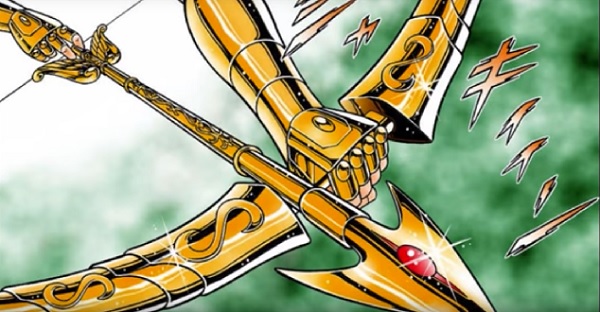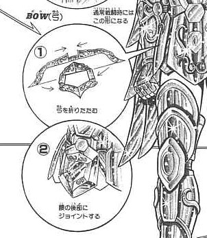 Así como las armas de Libra, el uso de este arma (que están normalmente prohibidas por Atenea) se deja a la discreción del Saint de Sagitario. Al parecer, no es la flecha de oro en sí la que es peligrosa, sino más bien su capacidad para transportar una concentración de Cosmos. Secuencia de despliegue del arco y la flecha de Sagitario Mientras Aiolos usa la flecha una sola vez en toda la serie, esta arma es a menudo utilizada por Seiya de Pegaso durante los eventos en el que es capaz de ponerse la Gold Cloth. Durante estos sucesos, el cosmos que Seiya en la flecha suele ser amplificado por el espíritu de Aiolos, así como el cosmos de los otros santos de bronce. Esto se traduce en una flecha cada vez más inusual y de gran alcance, hasta el punto en que puede alcanzar y atravesar deidades. Como podéis apreciar en las imágenes, tanto el arco como la flecha están camuflados hábilmente en las corazas de la armadura que protegen la espalda, el caballero debe sacar las piezas y desplegarlas para configurar arco y flecha, de una forma muy rápida y original... para ejecutar el ataque Seiya extrae el arco y la flecha, escondidos en la parte posterior de la armadura, toma entonces una posición de tiro intensificando al máximo su cosmos para permitir que la flecha alcance su objetivo y la lanza.