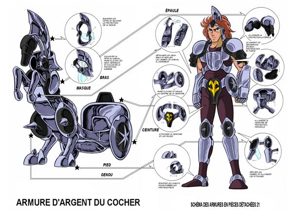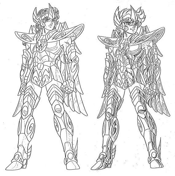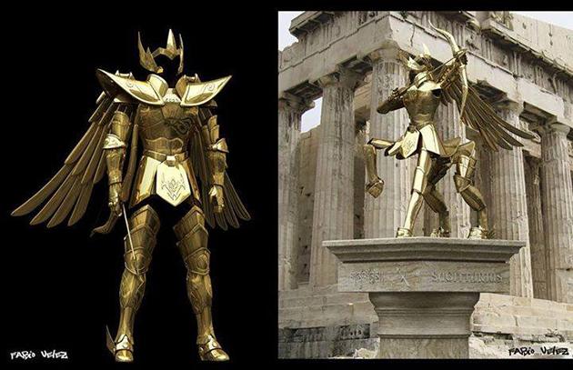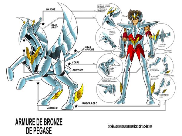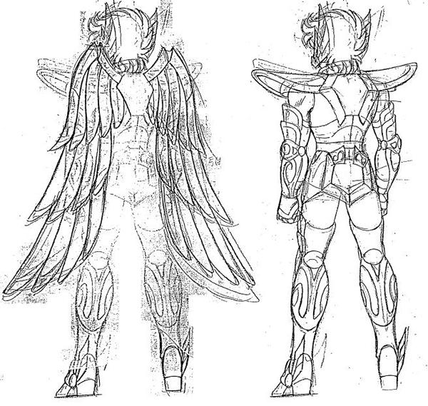 El simbolismo de las Cloth ecuestres en su forma Object Observando la forma Object de las Cloth, en especial las ecuestres, de la serie se pueden apreciar varios símbolos ocultos. Como se puede ver en el diagrama la Cloth de Sagitario tiene la pata delantera derecha levantada, lo que simboliza en las estatuas ecuestres que el caballero (Knight) que montaba ese caballo murió como consecuencia de las heridas sufridas en una batalla y Aiolos, de hecho, murió como consecuencia de las heridas sufridas contra Shura. Colorización de Jaxom (Francia) Una estatua ecuestre con ambas patas delanteras alzadas es un símbolo de que el caballero (Knight) que montaba el caballo murió en combate. Se puede apreciar ese detalle en las Cloths de Pegaso V3 y God Cloth en Elysion, lo que nos hace suponer que tal vez fuera intención de Kurumada, antes de la concepción del Tenkai, que el protagonista Seiya muriera en su enfrentamiento contra Hades.