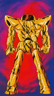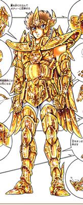 Fanart de Jerome Alquie (Francia) El pectoral es una pieza bastante masiva que cubre por completo el tórax, el abdomen, las caderas, la espalda, encajando por encima del cinturón. Es una placa de metal cilíndrica que envuelve el torso en la misma medida en todas las direcciones, girando sobre los hombros y axilas para formar la protección de la espalda. En la base del cuello forma un collar cuadrado, ligeramente elevado, pero no lo suficiente como para llegar a la mandíbula. Se extiende en diagonal hacia afuera para luego girar alrededor del cuello, pero no forma un anillo completo, de hecho, permanece abierta en la garganta, con un surco de varias pulgadas de largo que permite al Gold Saint agachar la cabeza. Tampoco se adhiere al cuello, con el fin de no obstaculizar los movimientos del guerrero. Está ajustado a los lados del cuello, donde encajan las hombreras de la armadura. Una sola imagen del episodio 37 muestra que la capa inferior de las hombreras, una placa horizontal cóncava que encapsula la parte superior del brazo, podría formar parte del misma pectoral, pero las demás, y el esquema técnico del manga, contradicen esta idea, mostrando que la pieza forma parte de las hombreras. El resto de la coraza pectoral es una placa lo bastante delgada pero más gruesa en los músculos del pecho, cubiertos de placas que se imitan su forma y grosor, que además protegen el corazón y los pulmones. Para unirlos, en el centro, debajo de la abertura del cuello, hay una hebilla heptagonal cubierta con frisos y de una altura de cinco o seis pulgadas en correspondencia con parte superior del esternón. Debajo de esta, la coraza del pectoral es atravesada por dos estrías circulares, probablemente para indicar los puntos donde el metal está dispuesto en capas para poder deslizarse una por debajo la otra cuando el Gold Saint se inclina hacia adelante y gira, lo que permite una movilidad total. Debajo de los brazos, por encima de los hombros y las caderas, el pectoral rota alrededor del cuerpo y se estrecha en la espalda, que es una simple placa plana, de metal delgado.
