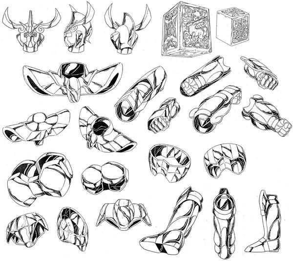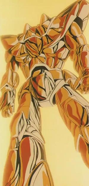 Número de piezas: 13 La armadura se compone de 13 piezas: dos espinilleras, que van desde el pie hasta la rodilla, dos rodilleras, que alcanza más o menos a media pierna, dos brazaletes, que van desde los dedos hasta los codos; dos protectores de los bíceps, dos hombreras, que también protegen mitad superior del brazo, un bloque central, que también incluye la protección de la espalda, el cinturón, y el casco. El color principal es el dorado en varios tonos.