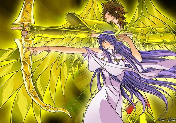 Fanart de Lunaatena (Italia) Se hizo alusión en la serie original, y fue confirmado en el episodio G, que la flecha de oro puede concentrar el cosmos de aquellos que la rodean, otras personas e incluso de almas de gente muerta, si estos lo desean, para poder fortalecer y hacer más potente su percusión. Este rol de vector de energía es retomado ante el Muro de los Lamentos, donde todos los Gold Saints transfieren su Cosmos a la flecha, y en el manga precuela Saint Seiya ~ The Lost Canvas la flecha que dispara Sísifo para matar al dios Oneiros es guiada e impulsada por el Cosmos de Atenea. Tengan en cuenta que la técnica Excalibur de El Cid logró cortarla en cuatro trozos. En el manga precuela Saint Seiya Episode G, Aiolos empuja su cosmos a su paroxismo y la tira sobre Apofis para crear una fuerza solar que mata al dios serpiente. En definitiva, la flecha de la Justicia puede derribar a un Dios y a un muro divino. Las armas de Libra y Sagitario encierran un poder increíble, por eso Atenea es reacia a usarlas, sólo pueden ser utilizadas en situaciones de extremo peligro, con el consentimiento de la diosa.
