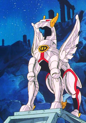En contraste con los anteriores el Cloth de Pegaso V1 tiene las cuatro patas firmemente plantadas en el suelo y ello es así porque el caballero (Knight) regresó a salvo de la batalla. Colorización de Jaxom (Francia) Curiosamente, el simbolismo de las patas del caballo no se aprecia en la forma Object de la Cloth de Centauro, pero es respetado con las patas delanteras levantadas de la Cloth de Auriga en forma Object, pues Capella murió en su combate contra Ikki. En definitiva, según la simbología de las estatuas ecuestres, un caballo con una pata levantada significa la muerte del caballero como consecuencia de las heridas y un caballo con dos piernas elevadas significa la muerte del caballero en batalla. En base a estos parámetros se hace difícil encontrar un significado en los Object de la Scale de Seahorse y el God Robe de Merak, que representa al caballo de ocho patas de Odín, Sleipnir.