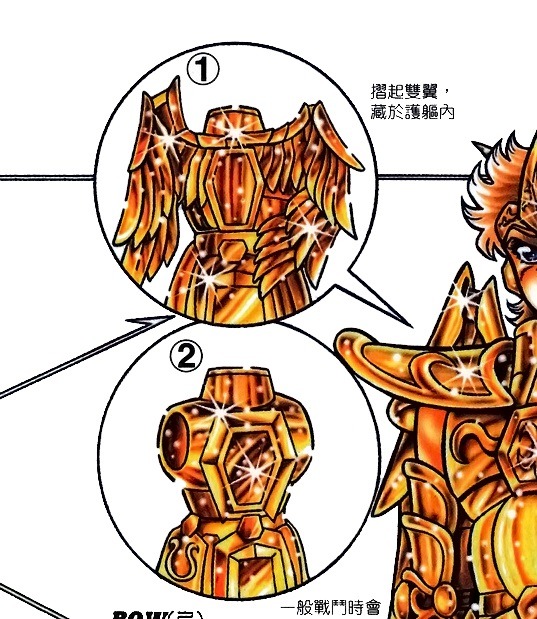 Bajo esta, sin embargo, están fijadas las alas de Sagitario, pieza única entre las armaduras de oro. Son un par de alas casi perpendiculares a la armadura y inclinadas hacia el exterior antes de elevarse abruptamente, alcanzando el nivel de la cabeza del caballero, y luego se doblan en diagonal hacia abajo. Están fijadas en los laterales de la parte superior de una placa hexagonal, colocada exactamente en el centro de la espalda y unida a dos piezas oblicuas rectangulares, cuya forma recuerda a la barra de tres puntas de Libra. Es en el vértice de estas dos piezas donde se encuentran las articulaciones que les permitan desplegarse cuando el Gold Saint vuela por los aires. El ángulo de la espalda debe poder cambiar, porque en algunas imágenes las alas posteriores se hacen paralelas a la pieza y simplemente se extienden hacia afuera. Se dividen en tres secciones, cada una más larga que la inferior y cada una está compuesta por cuatro plumas de oro rectangulares pero con las extremidades inferiores redondeadas y de una longitud de alrededor ocho pulgadas. Las plumas están desgastadas y ligeramente elevadas en comparación con las del nivel superior. En la primera sección parece haber cinco o cuatro, pero en realidad aquella más externa sólo sirve de soporte, alberga en su interior el borde lateral de las plumas más exteriores y se inclina con estas hacia abajo. De ello se desprende que las plumas de las dos secciones inferiores se unen exclusivamente a los extremos de aquellas inferiores y no se puede alargar más que de unos pocos centímetros. En general, las alas son largas y terminan apenas debajo de las rodillas. No son rígidas, sino más o menos flexibles, en algunas imágenes el conjunto parece una tela de metal. No está del todo claro si permiten volar en realidad, si se limitan a planear o si son sólo decorativas. La única indicación clara que sostiene que permiten volar viene en el film 2, cuya validez en la serie es dudosa. Toda la pieza es completamente de oro, más claro en las decoraciones del interior del tórax.