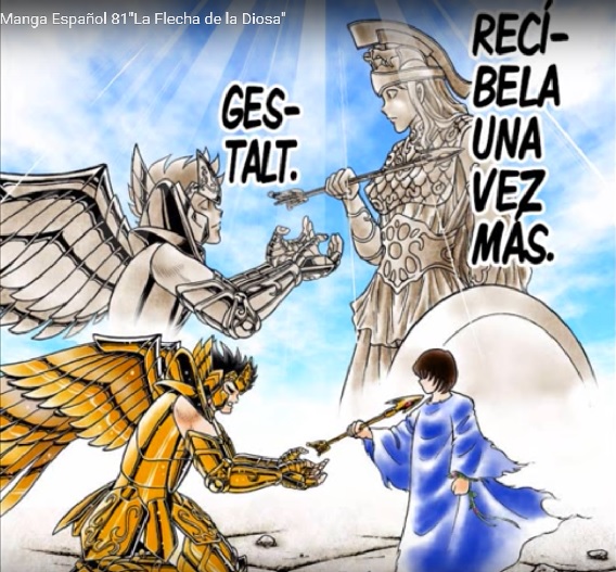 La flecha de la diosa Adicionalmente, al igual que los anteriores Gold Saints de Sagitario, Gestalt posee una flecha sagrada particular, de poder divino, que le fue entregada por la diosa Atenea en la era mitológica, llamada la "flecha de la Diosa" (女神の矢 Megami no ya), una flecha divina, poderosa y especial, que según parece se perdió en la anterior Guerra Santa del siglo XVIII. Es descubierta en el futuro, Marin la encuentra entre los escombros del Santuario en 1990. No aparece antes porque se supone que se perdió en la anterior guerra de los dioses y Kurumada la creó para Next Dimension xD. No se sabe mucho sobre ella aparte de que es un objeto entregado por Athena al Sagittarius Gold Saint desde la era de los mitos. Si puede matar otros dioses, aun no lo revela Kurumada. El caso de esta arma es muy parecido a la historia de Excalibur en el anime, fue un obsequio de Atenea al Gold Saint desde la era del mito. En este caso Kurumada retomó la idea de la teleserie clásica, el Gold Saint de Sagitario la posee desde tiempos inmemorables y es un objeto heredado generación tras generación por los Gold Saints de ese signo. Curiosamente no es un arma prohibida (a diferencia de las armas de Libra), pero se recomienda utilizarla con justicia. Supuestamente se perdió en la guerra santa del siglo XVIII, por ende Gestalt fue el último en poseerla. ¿Su aparición traerá suerte o infortunio?. Su apariencia es muy original, la punta está decorada con una gema roja, el inserto está reforzado con una placa, el tubo / astil lleva relieves como ornamentos y las plumas tienen la forma de alas de ave / ángel. Se dice que es una flecha sagrada cuya finalidad es proteger el amor y la justicia en la tierra, es un arma poderosa que no debe ser usada de manera imprudente. Un guerrero formidable como Capricornio Izō reconoce a Gestalt como el Gold Saint más feroz que ha vivido jamás.