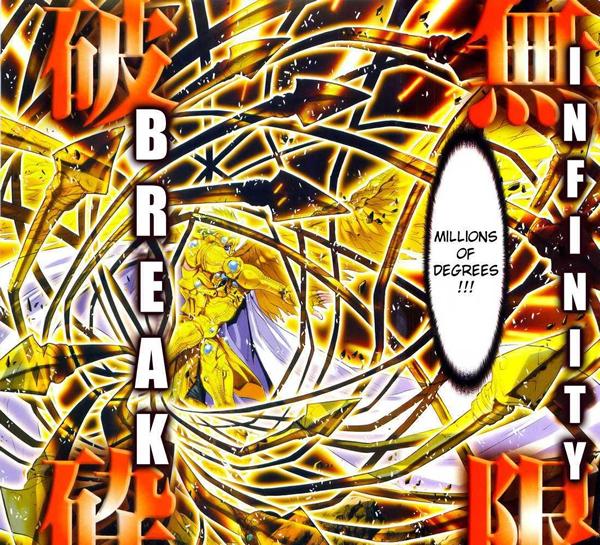 de Aioros Infinity Break, Episodio G. Es una técnica exclusiva del Episodio G. Parece ser su ataque más potente, Aiolos mueve sus manos en círculo y al intensificar su Cosmos al máximo materializa millones / un sinnúmero de flechas de luz con cabezas rastreadoras / buscadoras que lo atraviesan / perforan todo, evitando cualquier tipo de protección, las cuales comienzan a arremolinarse, golpean a sus enemigos dondequiera que estén. Esta técnica aparece exclusivamente en los capítulos especiales y en el volumen 0 del Episodio G, cuando Aiolos logra eliminar un batallón entero de soldados egipcios. Innumerables flechas son liberadas y parten de su cuerpo mientras vuelan en forma de torbellino o espiral y atraviesan todo lo que encuentran en su camino, en un ataque omnidireccional se reúnen en el objetivo. El ejército de Horus, el Dios Sol en Egipto, es aniquilado de un solo golpe en Saint Seiya Episode G, y las flechas logran incluso evaporar todo el fluido corporal de los soldados, que les aporta la vida, sus físicos se deshacen como mantequilla. Antes de morir y evaporarse estos comparan el ataque al poder de su dios Sol. Según palabras de Aiolos, en ese momento su Cosmos alcanza un calor de un millón de grados centígrados / Celsius. Es un ataque de energía ridículamente poderoso con muchas características incongruentes que supera cualquier defensa.