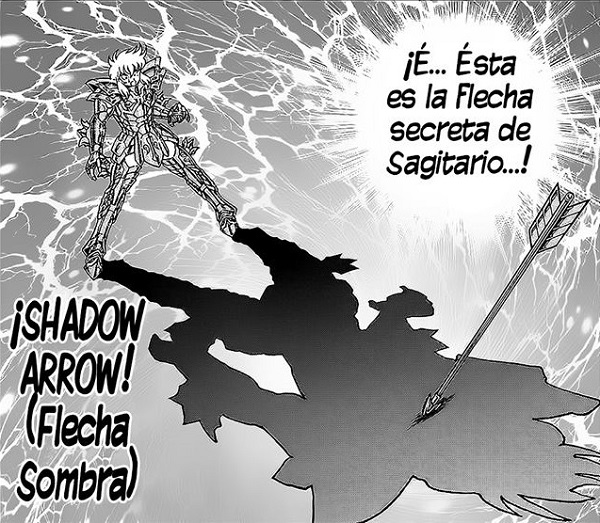 “Flecha sombra” (Episode Zero) Aioros apunta con los dedos índice y corazón de su mano derecha y lanza una flecha invisible la cual se adhiere a la sombra del contrincante, provocando que éste sea incapaz de moverse por un tiempo. La técnica paralizante tuvo efecto sobre Aphrodite, mas no sobre Shura, quien afirmó que nada puede detener a su espada sagrada Excalibur, con la que cortó la flecha y anuló la parálisis que afectaba al resto de su cuerpo. La flecha invisible es “una representación” de la técnica, parece intangible, ¿quizás esté hecha de cosmo como las flechas del Infinity Freak (técnica de Aioros en el Episodio G)?, ¿se puede romper al igual que el Crystal Wall (técnica de Mu y Shion)?.