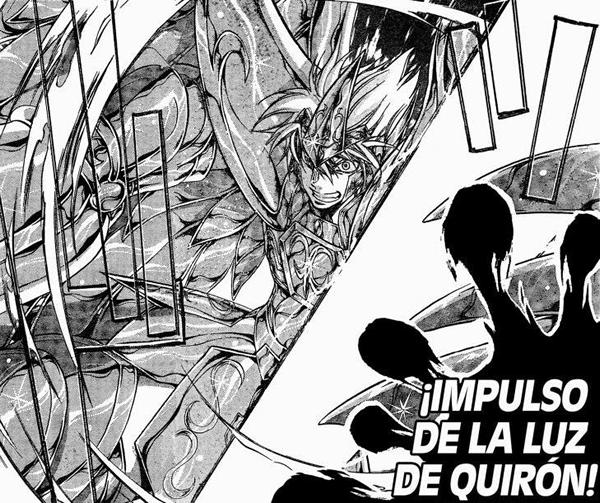 (el centauro mitológico). Es una técnica que consiste en la manipulación del Cosmos para emanar un poderoso viento dorado que es capaz de extinguir poderosos ataques. Sísifo extiende sus alas e impulsa un ancho haz de luz con los brazos que genera un torbellino masivo y fuertes vientos a su paso. El efecto no es muy explícito, pero la luz cubre por entero el barco de Aiacos, extinguiendo las llamas presentes en este y empujándolo lejos. La técnica no parece haber causado ningún daño concreto, ya sea a Aiacos o a su barco. El Gold Saint es capaz de invocar un viento dorado creado por la presión del Cosmo que rechaza el mal, el cual le permite extinguir las llamas negras e iracundas del juez Aiacos de Garuda y detener el ataque suicida del Garuda Ship, que estaba cubierto en llamas (capítulos 128 y 129 LC), incluso hace retroceder el barco de la oscuridad. Cheiron (Quirón) era uno de los más importantes centauros de los mitos griegos. Aunque no se le relaciona del todo con la constelación del Gold Saint de Sagitario, sino que con la del Silver Saint Babel, Kentauros. El impulso luminoso de Chiron hace referencia, por un lado, directamente al centauro de la constelación de Sagitario y, por otro, se relaciona con el dios Eolos (Aiolos), soberano de los vientos, ya que, con esta técnica, Sísifo crea una enorme presión de vientos dorados antes de hacerla explotar.