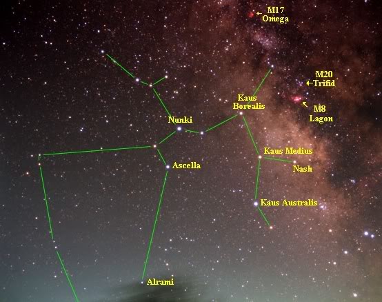 La constelación es vista como un centauro sosteniendo un arco y es conocida a veces por el célebre Quirón o Folo. Desgraciadamente para la mayoría de observadores del hemisferio Norte, Sagitario no sube nunca demasiado alto para ser apreciado plenamente. La constelación encierra un gran número de estrellas dobles y variables. No obstante, su principal atractivo reside en los objetos lejanos. Sagittarius o el arquero es una espectacular constelación de unos 700º cuadrados situada en el hemisferio sur observable desde casi todo el planeta, pero lógicamente en el hemisferio sur podemos contemplarla en su máximo esplendor. En el hemisferio sur es observable durante los meses de otoño, invierno y primavera; en cambio para los habitantes del hemisferio norte es observable durante las cálidas noches de verano a baja altura sobre el horizonte. La constelación de Sagittarius tiene la particularidad de que el ecuador de la Vía Láctea cruza la constelación en dos partes, y además el centro de nuestra galaxia se halla ubicada al sureste de la misma. El núcleo de la Vía Láctea se halla a 30.000 años luz del Sol, por tanto, podemos llevar a ver hacia esa distancia el núcleo de nuestra galaxia y una gran cantidad de cúmulos globulares, estelares y campos riquísimos de estrellas. Durante las noches despejadas de verano, donde os escribo estas líneas es espectacular ver las nubecitas lechosas de nuestra galaxia sobre Sagittarius, por tanto, es lógico pensar que para los habitantes del hemisferio sur debe ser un magnífico espectáculo contemplarla ya que culmina en el cenit y permanece más horas sobre el horizonte. La forma de la constelación no se asemeja a un arquero, aunque hay que tener una cierta originalidad para poder distinguirla, más bien, tiene forma de tetera.