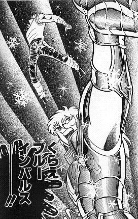 técnica de hielo según el Cosmo Special El golpe Impulso Azul (‘Blue Impulse’) es un homenaje hecho por Kurumada a una importante institución de la Aeronáutica Japonesa. El Blue Impulse (‘Buru Inparusu’, en japonés), o Escuadra 11, es el equipo de demostración aérea de Fuerza de Autodefensa Aérea de Japón. Formado en 1960, originalmente como un equipo de seis F-86 Sabres, el equipo pasó a la Mitsubishi T-2 en 1980 y luego a la Kawasaki T-4 en 1995. Su sede está en la Base Aérea de Matsushima. Su mote es "El desafío de la creación", y los colores oficiales son azul y blanco. El Blue Impulse ha sido homenajeado en otros mangas anteriores y posteriores de Saint Seiya, como Urusei Yatsura. HABILIDADES ESPECIALES : Alexer se enfrenta a Hyoga (desprovisto de su Cloth), y encaja una Aurora Execution con el Cero Absoluto sin morir, un hecho extraño en Saint Seiya, aunque podemos preguntarnos si Hyoga no retuvo su golpe por respeto a Natassia.