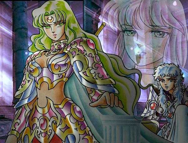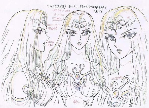 Fanart de Juni Anker (Nicaragua) - Artemis versión film 5 Debido a las incoherencias anime-manga, actualmente tenemos dos versiones de la diosa Artemis, la que aparece en el film 5 "Tenkai Hen Overture" de cabellos verdes y la que aparece en el manga Next Dimension obra de Kurumada, con una luna dibujada en su frente y más ligera de ropa.
