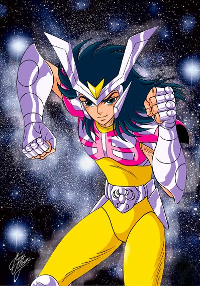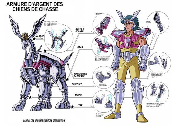 PARTICULARIDADES DE LA ARMADURA : Hound no Cloth. ハウンドのクロス : “La Armadura del Lebrel”. Perros de Caza (Canes Venatici) es una de las oscuras constelaciones modernas, del siglo XVII, introducidas por Johannes Hevelius en 1690. Representa a los dos perros Asterion y Chara, ambos canes aparentemente persiguen a la Osa Mayor. La armadura no tiene ninguna capacidad especial conocida. Colorización de Jaxom (Francia) La Hound Cloth es virtualmente idéntica en manga y anime, excepto en el hecho que como la mayoría de Silver Cloths la versión del anime cubre un porcentaje corporal mayor, sobretodo a nivel de las piernas. Las pocas modificaciones que se aprecian se sitúan en el pectoral, que en el anime está compuesta de menos piezas, y en el mask, que es ligeramente más sencillo en el anime en la parte frontal. Peto y diadema son más estilizados y completos en su versión animada. Las protecciones de brazos, rodilleras y cinturón son iguales al manga, sólo se hizo que las botas cubrieran completamente los pies en el anime. En el manga, el Cloth es plateada y las ropas blancas, mientras que en el anime son amarillas.