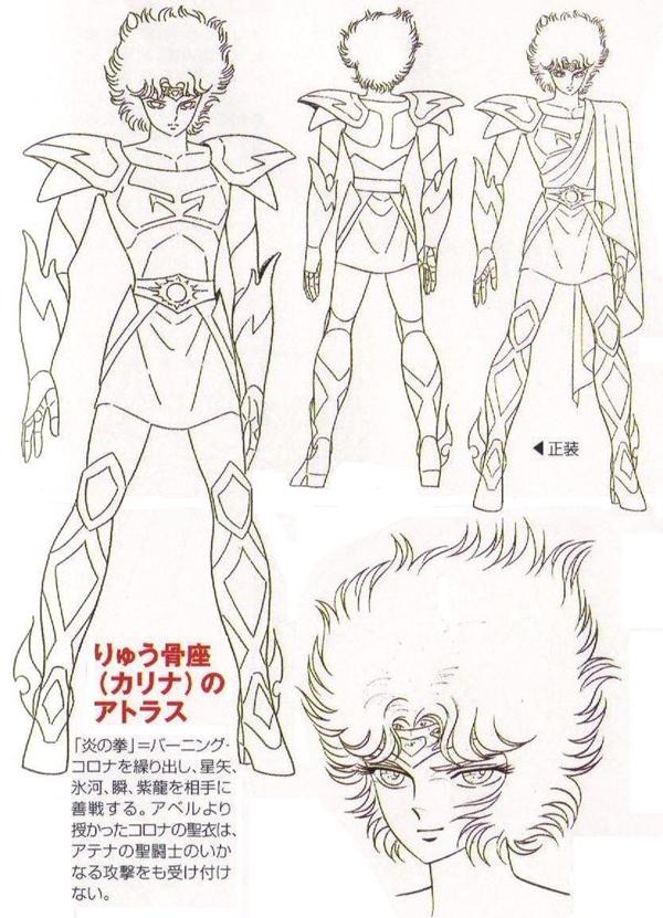 Atlas forma parte del trio de Corona Saints al servicio de Abel, es un joven de cabello corto rubio ondulado-lazio, ojos azules, tez blanca, apariencia atlética, muy ágil y cuyo cosmo rivaliza con el de los caballeros de oro. Es un personaje que sólo aparece en el tercer film de Saint Seiya. Es un buen combatiente, ello le hace ser arrogante y soberbio, y defiende con fanatismo a Abel. Fue derrotado tras luchar contra Seiya, Shiryū y Hyōga equipados con Gold Cloths. Su indumentaria es una mezcla de armadura convencional combinada con ropaje clásico. Atlas. アトラス (kana) / Ατλας (griega) (Atorasu (romaji) / Atlas) “Atlas”. Nombre del líder de los Santos de la Corona. Corona Saint no Lider. コロナの聖闘士のリーダー “Así se lo presenta en los panfleto del a tercer película a Atlas de la Corona". ETIMOLOGÍA DEL NOMBRE : アトラス (kana) / Ατλας (griega) (Atorasu/ Atlas) Atlas : Referencia a Atlas, nombre original de uno de los Titanes de la mitología griega, hijo del titán Jápeto y de la ninfa Clímene, que fue condenado a cargar el mundo en su espalda (en otras tradiciones fue el segundo hijo de la Titánide Eurymédon). Sus hermanos fueron Epimeteo, Prometeo y Menoetius. Atlas engendro a las Pléyades con la Oceánide, Pleione. Atlas peleó con los titanes en la guerra contra las deidades olímpicas. Como castigo, fue condenado a cargar para siempre en sus espaldas la tierra y el firmemente en sus hombros la gran columna que los separa. Carina es una palabra