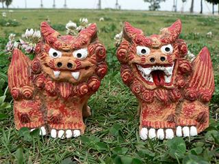 Los shisa son seres mitológicos japoneses típicos de la cultura Ryukyu presente en la prefectura de Okinawa. Los shisa son un animal, mezcla entre león y perro, que muy probablemente sean, al igual que los koma-inu, una derivación local de los perros de Fu chinos, propios del Budismo. Generalmente se encuentran representados sentados o agazapados, y en parejas, en las cuales uno de ellos presenta la boca abierta y el otro la boca cerrada (en este sentido se asemejan a los guardianes Nyo), atribuyéndoseles género masculino y femenino respectivamente. Tradicionalmente, el ejemplar izquierdo era llamado perro guardián, el derecho, era, concretamente, el llamado shisa. En la cultura de las islas Ryukyu se colocan por pares flanqueando las puertas de entrada o sobre el tejado frontal de las casas, donde juegan un papel protector como guardianes contra los malos espíritus (ver Shintoísmo). Las figurillas que los representan suelen fabricarse en cerámica o yeso, y suelen contar con motivos humorísticos. Originalmente los ‘shisa’ se colocaban sobre los tejados de palacios, templos y otros edificios donde se asentaban los poderes imperiales o locales. El uso de shisa como talismán se difundió en la población de Okinawa a finales del siglo XIX, cuando se levantó la prohibición del uso de tejas rojas a los plebeyos. También es habitual su uso en los flancos de las puertas.