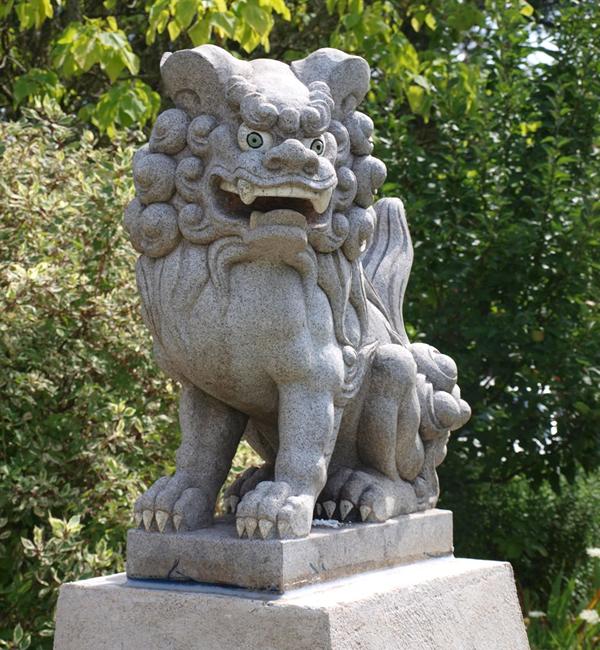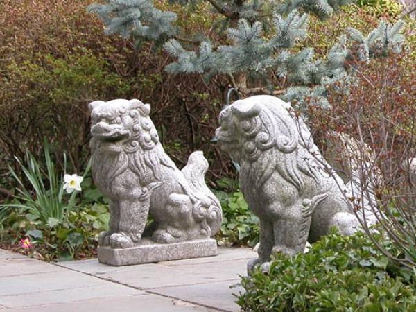 Los leones siempre se presentan en pares, siendo una manifestación del yin y el yang, la hembra representa el yin y el macho el yang. El león macho extiende su pata delantera derecha sobre una bola llamada simplemente una "bola de bordado" (xiù qiú, 绣球), que a veces está tallada con un modelo geométrico. La hembra es esencialmente idéntica, pero tiene un cachorro bajo la pata (izquierda) más cercana del varón, que representa el ciclo de la vida. Simbólicamente, la león hembra protege los que moran en el interior, mientras que el león macho protege la estructura. A veces, la hembra tiene la boca cerrada y el macho abierta. Esto simboliza la enunciación de la palabra sagrada "om". Sin embargo, las adaptaciones japonesas afirman que el león macho está inhalando, en representación de la vida, mientras que la león hembra exhala, lo que representa la muerte. Otros estilos tienen dos leones con una único gran perla en cada una de sus bocas parcialmente abiertas. La perla está tallada para que pueda rodar alrededor en la boca del león pero es de un tamaño lo suficientemente grande como para que nunca se pueda sacar. De acuerdo con el feng shui, la colocación correcta de los leones es importante para garantizar su efecto beneficioso. Al examinar un edificio cuya entrada deba ser protegida, esta debe estar orientada en la misma dirección que los leones, el macho se coloca a la izquierda y la hembra a la derecha. Así que cuando se mira por la entrada desde el exterior del edificio, frente a los leones, el león macho con la pelota está en la derecha, y la hembra con el cachorro está a la izquierda.