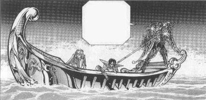 por Seiya sobre su barca, en el anime no canta y parece verdaderamente