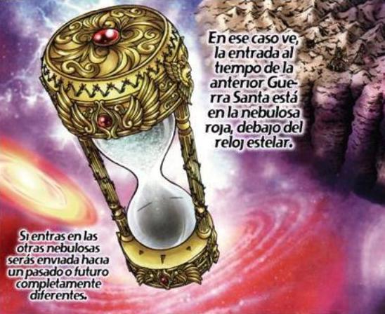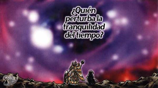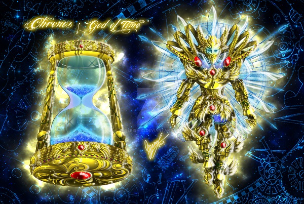 HERENCIA MITOLÓGICA : Chronos y Cronos En la mitología griega, Cronos (o Khronos, Tiempo en griego) es constantemente confundido con Cronos (Krónos), el titán hijo de Urano (el Cielo), casado con Rea y padre de Zeus. Aunque sean distintos etimológicamente, ambos fueron identificados con el tiempo personificado, tal vez, por una homónima forzada. La raíz de las palabras cronología, crónica y otras que en castellano remiten a Cronos; en inglés pasan a ser chronology y chronic, como en Chronos. Vale la pena recordar que el radical crono-, en castellano, deriva del griego khrónos = 'tiempo'. En las tradiciones órficas, Chronos (Χρόνος), es visto como el dios primordial del Tiempo. Es un ser distinto de Cronos (Κρόνος), rey de los Titanes, aunque las tradiciones más antiguas acaben por mezclarlos y dar al titán Cronos algunos atributos de Chronos. Cronos era considerado como un dios intangible o inmaterial, con un cuerpo de serpiente con tres cabezas, una de hombre, una de toro y otra de león. Apareció en el origen de todo, y él y su esposa Ananké (la fatalidad o el Destino) de forma serpentina envolverían el huevo-mundo para dar a luz al Universo, es considerado el Padre del Eter y del Caos (todo deriva de la mitología griega). En la mitología griega, Chronos era la personificación del tiempo. También se le llamaba Eón o Aión. En los mitos griegos, Chronos era el dios de las Edades (desde la Dorada hasta la de Bronce) y del zodiaco. Surgió al principio de los tiempos formado por sí mismo como un ser incorpóreo y serpentino con tres cabezas: de hombre, de toro y de león. Se entrelazó con su compañera Ananké (la Inevitabilidad) en una espiral en torno al huevo primigenio y lo separó, formando el universo ordenado de la tierra, el mar y el cielo. Chronos permaneció como el dios remoto e incorpóreo del tiempo que rodeaba el universo, conduciendo la rotación de los cielos y el eterno paso del tiempo, de ahi porque Kurumada lo dibujó en next dimension en forma de nebulosa. Ocasionalmente se le aparecía a Zeus con la forma de un hombre anciano de largos cabellos y barba blancos con cuerpo bien constituido, de ahi porque de que quizás Kurumada lo dibujó en el hipermito con cuerpo y armadura, pero la mayor parte del tiempo permanecía como una fuerza más allá del alcance y el poder de los dioses más jóvenes. Los antiguos griegos tenían dos palabras para el tiempo: chronos y kairos. Mientras Cronos se refiere al tiempo cronológico o secuencial, que se puede medir, kairos se refiere a un momento indeterminado en el tiempo, en el que ocurre algo especial en la teología, es "el tiempo de Dios". Chrono a menudo se ha confundido con el Titan Cronos, especialmente durante el periodo alexandrino y el Renacimiento. De acuerdo con teogonía órfica, Chrono surgió al principio de los tiempos, formado por sí mismo. Era un ser incorpóreo y serpentino con tres cabezas, una de hombre, una de toro y otra de león. Se unió a su compañera Anaké (la inevitabilidad) en forma de espiral alrededor del huevo primogénito separándolo, formando entonces el Universo ordenado con la Tierra, el mar y el cielo. Permaneció como un Dios remoto y sin cuerpo, el tiempo, que rodeaba el Universo, conduciendo la rotación de los cielos y el caminar eterno del tiempo, apareciendo ocasionalmente ante Zeus en la forma de un anciano con largos cabellos y barba blancos, aunque se mantuvo la mayoría de las veces en forma de una fuerza más allá del alcance y el poder de los dioses más jóvenes. Una de las representaciones más extrañas de Cronos es la de un hombre que devora a su propio hijo, un alto canibalismo difícil de entender hoy en día. Sin embargo, esta representación es debida al hecho de que los antiguos griegos tomaron a Cronos como el creador del tiempo, de todo lo que existe y que puede ser relatado, tal como el Dios único y creador de los cristianos, judios y musulmanes, y por este hecho, se consideraban hijos del tiempo (Chronos), y puesto que es imposible huir del tiempo, todos serán vencidos (devorados) antes o después por el tiempo. Una posible explicación de esta representación es la confusión con el titán Cronos, que comía a sus hijos para que no se rebelasen contra él y tomasen el poder en la Tierra como él hizo con su padre, Urano. Los romanos lo llamaron Saturno y por eso el planeta que ahora se conoce por ese nombre una vez fue llamado "Khronos" por los astrónomos griegos. Era la deidad celeste más distante, considerado como el séptimo de los siete objetos celestes visibles a simple vista. Una vez que tenía la mayor traslación observable en el cielo (cerca de 30 años), los astrónomos griegos y romanos lo consideraron el guardián del tiempo o "Padre del Tiempo", ya que no había conocimiento de cualquier otro objeto con mayor periodo repetitivo (traslación). Fue precisamente esta característica astronómica que llevó a los estudiosos del arte a representar a su figura como un anciano con largos cabellos y barbas blancas, como se mencionó anteriormente. Por lo tanto, también vino de ahí la palabra crónica seguida de Chronos.