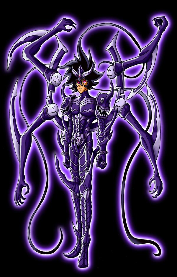 PARTICULARIDADES DE LA ARMADURA : Soma: Megas Drepanon (Gran Hoz) ACCESORIOS : AURA : HERENCIA MITOLÓGICA : Al principio del mundo, las deidades primordiales Urano (el Cielo) y Gaia (la Tierra) engendraron a los Cíclopes, los Hecatónquiros y los Titanes. Urano, temiendo a los Hecatónquiros los arrojó al Tártaro con los Cíclopes (o según otras versiones hacía el amor con Gaia continuamente para evitar que salieran de su vientre). Gaia, enojada, pidió a los Titanes que la ayudarán a vengarse dee Urano, y aquel que aceptó era el menor de ellos, Cronos (en griego: Κρόνος). Cronos luchó contra Urano y le cortó los testículos con una hoz. Estos cayeron al océano y engendraron a Afrodita, la sangre de Urano cayó sobre Gea y dio a luz a los Gigantes, las Erynias, las Méliades (ninfas de los bosques) y según algunas fuentes a las Telquinas. Urano predijo sin embargo que Cronos sufriría un destino similar al suyo. Cronos, ingrato, volvió a encerrar a los Cíclopes y Hecatónquiros que le habían ayudado y se casó con su hermana Rea, gobernó como maestro supremo sobre el mundo, preocupado por la profecía de su padre. Empezó a devorar a sus hijos con Rea y engulló así a Deméter, Hera, Hades, Hestia y Poseidón, pero cuando el sexto hijo, llamado Zeus, nació, Rea no pudo resignarse a que muriera también y le dio a Cronos una piedra envuelta en una tela que se tragó sin hacer preguntas. Rhea colgó a Zeus de un árbol para que no se encontrara ni en el cielo ni en la tierra, ni en el mar, donde fue criado por la ninfa Adamantea y la cabra Amaltea. Según otras versiones, sin embargo, Rea prefirió esconderlo en una cueva del monte Ida, donde las Curetes bailaban día y noche para cubrir el llanto del bebé. Zeus, una vez adulto, intentó derrocar a Cronos y liberar a sus hermanos y hermanas. Hizo tragar a su padre un pez que le ofreció Gaia que provocó que vomitara a los dioses que se había tragado, entonces Zeus reveló su identidad, lo que condujo a la gran guerra entre los dioses y los Titanes, denominada Titanomachia. Todos los Titanes no participaron en el combate, algunos se mantuvieron neutrales como Oceanos y Tetis. Zeus hizo nuevos aliados con la liberación de los Cíclopes y los Hecatónquiros, encarcelados por Cronos. Tras diez años de lucha, los dioses olímpicos fueron capaces de derrotar a los Titanes. Los que participaron en la Titanomachia fueron arrojados al Tártaro, y Zeus, Poseidón y Hades se dividieron entonces el cielo, los océanos y el mundo de los muertos. Cronos (Κρόνος) no debe ser confundido con Chronos (Χρόνος), la personificación del tiempo en la tradición órfica, aunque más tarde se los suele confundir, y a menudo se adjudica a Cronos el reloj de arena como símbolo así como la hoz. En Saint Seiya G, Okada comparte este principio y asocia fuertemente su Cronos al tiempo. Es el más joven y el más importante de los Titanes. Personifica el tiempo o la fecundidad de la tierra. Es el Titán cuya descendencia reviste mayor importancia. A partir de él se desarrollan los destinos que llevan al poder a la generación divina de los Olímpicos. Se unió a su hermana Rea. Juntos engendraron a Hestia, a Demeter, a Hera, a Hades, a Poseidón y a Zeus. Personifica el tiempo o según otras versiones la fecundidad de la tierra. Es el Titán más importante y el más joven de los doce. Es el que castró a su padre Urano. Pero, por temor a que un hijo suyo lo destronase, los devoraba cuando nacían. Fue destronado por su hijo Zeus. Es el único que se supone que vive en la isla de los Bienaventurados (lo más parecido al cielo cristiano). Durante el tiempo que él reinó en la tierra se considera la edad de Oro en los Griegos, se le atribuyen grandes invenciones, victorias y hazañas durante un longevo periodo.