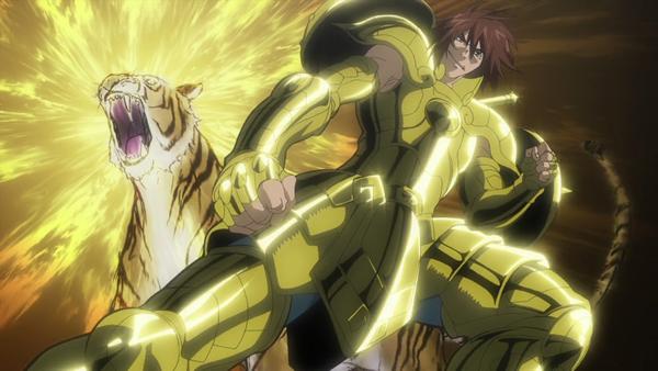 Un tigre feroz y armado, con ropaje dorado y las