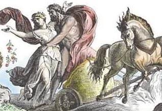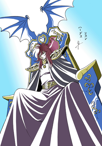 Fanart de Arman de Virgo (Chile) Zeus, una vez adulto, intentó derrocar a Cronos y liberar a sus hermanos y hermanas. Hizo tragar a su padre un veneno ofrecido por Gaia, que le hizo vomitar a los dioses que se había tragado, luego Zeus reveló su identidad, lo que condujo a la gran guerra entre los dioses y los Titanes, llamada Titanomaquia. Todos los Titanes no participaron en el combate, algunos permanecieron neutrales, como Oceanos y Tetis. Zeus hizo nuevos aliados con la liberación de los Cíclopes y los Hecatónquiros encarcelados por Cronos. Después de diez años de lucha contra los olímpicos fueron capaces de derrotar a los Titanes. Aquellos que tomaron parte en la Titanomaquia fueron arrojados al Tártaro y Zeus, Poseidón y Hades se dividieron entonces los cielos, los océanos y el mundo de los muertos. Hades (Plutón por los Romanos) es el dios del inframundo. Era hijo del titán Cronos y de la titánide Rea y hermano de Zeus y Poseidón. Fue apodado "el rico", porque dirigia el mundo subterráneo situado bajo tierra para los griegos, y es de la tierra que se extraen las piedras preciosas. El infierno griego era el lugar a donde iban todas las almas, a diferencia del infierno y paraíso cristianos, siendo los equivalentes griegos el Tártaro y los Campos Elíseos. Aunque Hades es a menudo considerado un dios malévolo en obras modernas (entre ellas Saint Seiya), fue visto como un dios neutro para los griegos de la antigüedad y apenas intervino fuera de su reino. Hades era considerado justo, pero la gente evitaba mencionar su nombre porque temían a la muerte que les esperaba. Cabe señalar que la muerte no está encarnada por Hades, sino por Thanatos, Hades es aquel que reina en el mundo de los muertos, donde se encontraban las residencias de Hypnos y Thanatos. Hades odiaba, por encima de todo, que alguien tratara de escapar del mundo de la muerte o que alguien tratara de robar las almas de su reino, entonces su venganza y su tenacidad eran terribles. El único que logró convencer a Hades para que devolviera voluntariamente a una persona fallecida fue el virtuoso Orfeo, que pudo emocionarlo con su música, aunque el desenlce del mito es bastante trágico, debido a la imprudencia del joven. Plutón posee un valor puramente eufemístico, que permite ocultar el verdadero carácter de Hades, cruel, severo, implacable, inflexible, odiado por todos (según el canto IX de la Ilíada), no podía, con ese nombre, recibir los honores debidos a un dios. Las inscripciones indican que Plutón recibía muy poco culto en la tierra, poseyendo sólo un templo en Eleusis y otro menor en Elis, que se abria una vez al año y por un único sacerdote. En general Hades permanece calmado en su majestad de "Zeus subterráneo", confinado en la oscuridad del Erebo, de donde salió apenas dos veces, una para secuestrar a Perséfone. Excepto por esa temerosa aventura, Hades ocupa su tiempo castigando o repeliendo a los intrusos que respetaban sus dominios, como el audaz Pirítoo, quien, acompañado por Teseo, penetró en el Hades para secuestrar a Perséfone. También luchó contra Heracles, quien descendió a los infiernos para capturar a Cerbero. Fue durante esta batalla que el héroe lo hirió el hombro derecho con una flecha. Tan grande era el dolor, que el señor de los muertos tuvo que subir al Olimpo y solicitar los servicios de Apolo, el dios sanador, quien le aplicó un bálsamo maravilloso en la herida. En el infierno, Hades reinaba sobre los muertos. Era despiadado, no permitía que nadie regresar entre los vivos, pero nunca fue considerado como maléfico, satánico, o injusto. Era asistido por demonios y genios múltiples tales como Caronte, Minos o Cerberus que estaban bajo su mando. Persephone se sentó su lado con tanta crueldad como él. El dios la había secuestrado de su madre Deméter. Esta última, con la ayuda de Zeus, logró que Hades aceptara compartirla con ella. Así, pudo mantenerla cerca de él cuatro meses al año. Ellos no tuvieron descendientes. Sin embargo, según una leyenda, la pareja habría engendrado a las Erinias. Hades rara vez interviene en las leyendas. Además de la historia del secuestro de Perséfone, que pertenece al ciclo de Deméter, lo vemos apenas en otro mito, en relación con Hércules. La Ilíada cuenta que durante el descenso del héroe al Inframundo, Hades quería prohibirle el acceso a su reino. Se reunió con él en la puerta del infierno, pero Heracles lo hirió con una flecha en el hombro, por lo que Hadès tuvo que ser llevado con celeridad al Olimpo, donde Pan, el dios sanador, le aplicó un bálsamo maravilloso, cicatrizando la herida con rapidez. Algunas versiones muestran a Heracles lanzando al dios una enorme piedra. Sea cual sea la historia, el hijo de Zeus lo superó. Contrariamente a Zeus y Poseidón, quienes engendraron a muchos hijos, Hades no tuvo ninguno y su única historia de amor se encuentra en su esposa Perséfone, hija de la diosa Deméter. Él la raptó cuando estaba recogiendo flores en un campo, Hades emergió del suelo y se la llevó al inframundo, causando un gran dolor en Deméter, que dejó el cuidado de los cultivos. Deméter le pidio a Zeus que interviniera. Zeus, viendo que los seres humanos sucumbían a la hambruna, ordenó a Hades que devolviera a Perséfone, pero éste hizo comer a la joven semillas de granada que la obligan a quedarse alli. Así que tuvieron que llegar a un acuerdo y Persefone viviria cada año 6 meses en el mundo de los vivos y otros 6 meses en el inframundo, la joven debería regresar periódicamente al reino de Hades durante cuatro meses al año, que corresponden a otoño e invierno. Asi se convirtió en la esposa de Hades, y en reina de los muertos. Los símbolos de Hades son su carro tirado por cuatro caballos negros, las llaves del infierno, una especie de tenedor de dos dientes que utiliza como arma, Cerbero y la Kunea, que era un casco que le permite hacerse invisible y que prestó en a
