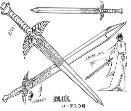 Lo que hace a la espada de Hades tan especial son los símbolos que cubren su hoja. Es difícil determinar el origen de estas señales, pero una posibilidad serían los símbolos mayas como los que se pueden ver en el Palacio del Gobernador en la ciudad de Uxmal, en el sur de México. El complejo está fechado alrededor de 450 a 600 dC, y fue un lugar importante para la ceremonia maya. El palacio decorado con tales símbolos fue dedicado al estudio del cielo, donde se realizaban las observaciones astronómicas, especialmente la predicción y la observación de los eclipses, quizás la relación esté con la técnica Greatest Eclipse, uno de los mayores poderes de Hades en Saint Seiya. La puerta del edificio también fue colocado en alineación perfecta con el planeta Venus, astro-base del calendario religioso del pueblo maya, pueblo antiguo que tenía la astronomía más avanzada del mundo, siendo superado solamente por la astronomía moderna. No parece que haya una respuesta contundente a la naturaleza de los signos que se aprecian en el filo de la espada de Hades, más que el hecho de que son parte del diseño concebido por Masami Kurumada. Esas inscripciones son similares a las runas usadas por los pueblos germánicos antes de adoptar el alfabeto latino, pero son inventadas, pues no pertenecen a ningun alfabeto rúnico en particular. Así que seguramente no tienen ningún significado. Da la impresión que que el verdadero propósito es que sean ornamentos, para enriquecer el diseño del filo del arma.