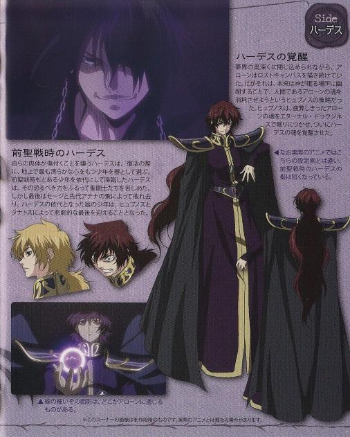Alone / Ahărōn. アローン (Aroone) También podría hacerse referencia al nombre hebreo Alón. Incluso podría ser el nombre bíblico Aarón/ Arón, que fue hermano de Moisés. El problema puede estar dado que para escribir el nombre Aaron (en forma inglesa) la doblegación se da en la “A” アーロン pero el nombre original, la tiene tanto en la “A” como en la “O”. Según se fundamenta podría ser la forma hebrea del nombre Aaron o Aarón. En hebreo se escribe אַהֲרֹן Ahărōn y en árabe هارون Hārūn. Queda claro que el nombre tiene dos tonos. El primero prolonga la A y el segundo doblega la O o bien hace caer el acento. Por lo tanto, no es muy raro pensar que se trata de ese nombre hebreo. Si se tratare del nombre hebreo su significado quiere decir “Aquel que habita en las montañas” o “Aquel que lleva la luz”, pero también a veces se lo traduce como “Aquel que es Iluminado” o “Aquel que es alto”. Existen variantes de la grafía según el país que son Aaron (forma inglesa), Aarón (española), Aaró (catalán), Aaronne (italiana) y así hay más ejemplos. También puede tratarse del nombre griego Aarón en referencia a un Mago que vivió en el tiempo del emperador Manuel Comneno. Según se dice tenía a su favor legiones de demonios a sus órdenes. Además se dedicaba a la Nigromancia, pues en su aposento entapizado de negro en la casa donde hacia su trabajo se encontró un hombre que tenía los pies encadenados y el corazón traspasado por un clavo, tales fueron al menos las acusaciones por las cuales se lo mandó se lo hizo desollar, después de haberle cortado la lengua. HISTÓRICO : Hades nació en la era mitológica como hijo del Titán Cronos y de Rea. Sin embargo fue devorado por su padre debido a que este pensaba que sus hijos algún día lo derrocarían. Es salvado por su hermano menor, Zeus y es así como éste, junto con Poseidón una vez triunfantes, se reparten los reinos del mundo. Hades toma por posesión suya la tierra de la muerte, el Inframundo. Unas generaciones después, Hades observaba plácidamente desde el Inframundo al reino que le correspondía a Atenea, la Tierra. Es después de la Guerra Santa que esta sostiene contra Hades, que el Rey del Inframundo comienza su interés por el reino de Athena. Junto a dos de sus más grandes subordinados, Hipnos y Tánatos, y una orden de 108 Espectros regidos por estrellas demoníacas los cuales visten Surplices, Hades levanta su espada para iniciar una feroz cruzada que duraría milenios, la Guerra por el dominio del mundo de los hombres contra Athena. Es así como estalla la primera Guerra Santa contra Hades en plena época mitológica. Se desconocen muchos detalles de este conflicto, lo único que se sabe es que el cuerpo de Hades, fruto de la unión de Cronos y de Rea es lastimado por primera vez en la historia por el Santo de Pegaso. Desde ese momento, el vínculo entre Pegaso, Hades y Athena nace, el cual se prolongaría durante milenios. De inmediato, un malherido Hades regresa al Inframundo para esconder su cuerpo en los Campos Elíseos para regenerarse, lo cual lo obligaría en las siguientes Guerras a usar cuerpos huéspedes de los humanos más puros para reencarnar demostrando con ello lo extremadamente celoso que es con su propio cuerpo. Hades no fue herido superficialmente por el Saint de Pegaso en el pasado, él mismo menciona en el manga ya al final que Seiya luce idéntico al único hombre que ha logrado herirlo y que eso sucedió en la era de los mitos. Hades pierde totalmente la compostura cuando lo recuerda e intenta desesperadamente matar a Seiya y sellarlo para que nunca vuelva a reencarnar. Está claro que el Pegasus Saint de la era de los mitos no sólo le hizo un rasguño superficial, lo que concuerda con lo que Libra Dōko menciona, que Hades detesta que su cuerpo físico sea dañado aun de la manera más ínfima, cuando les revela que en la anterior guerra entre dioses descubrieron que su cuerpo descansaba en el Elysion. 500 años antes de la época actual, Hades resurge en plena época moderna. Los datos sobre esta Guerra Santa son prácticamente nulos, sin embargo los Mangas The Next Dimension y The Lost Canvas aportan valiosos datos. Según The Next Dimension, al finalizar dicho conflicto, el alma de Hades es encerrada dentro de su propia espada, la cual reposa en un mausoleo cercano al Castillo Heinstein. The Lost Canvas aporta el relato de que sólo dos Santos lograron sobrevivir en dicha guerra, Sage de Cáncer y Hakurei de Altar (ambos son hermanos). Según ellos, los Dioses Gemelos Tánatos e Hipnos arrasaron con todos sus camaradas quedando sólo ellos dos con vida, sin posibilidad de hacerles frente a estos terribles dioses. Hakurei es nombrado Pope del Santuario de Athena pero cede este puesto a su hermano menor quien lo ocupa hasta la siguiente generación. Las almas de los Espectros son selladas en la Torre ubicada mil kilómetros al este de Rozan. También se sabe que Athena les dejo una Espada protegida por las plegarias de esta diosa hacia sus Santos. En la época de la ilustración, el Emperador Hades nuevamente hace aparición después de un periodo de 250 años de estar dormido. Sin embargo la historia de esta Guerra Santa se divide en dos mangas distintos, Saint Seiya The Next Dimension y Saint Seiya The Lost Canvas. En Next Dimension: El cuerpo huésped de Hades es un joven pintor llamado Alone. Aparece por primera vez en un recinto ubicado en Italia, llamado los Campos Elíseos (debido a su parecido con los Elíseos del Inframundo). Cuando se encontraba recogiendo flores tranquilamente, llegan Shion de Aries y Dōko de Libra, quienes durante un instante no se lograban mover debido al poder del Emperador (quien aún no se había manifestado completamente), cuando dejar de emitir su Cosmos, Shion planea asesinarlo. Sin embargo es salvado por Tenma, amigo de infancia de Alone, quien huye junto a él. Cuando se encontraban hablando