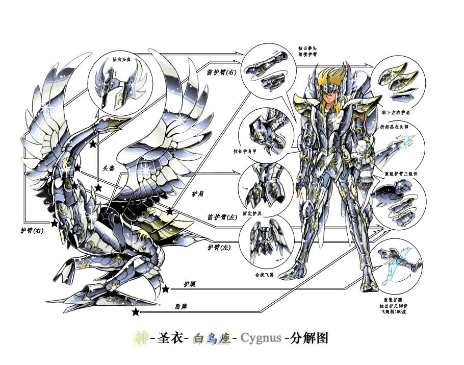 Número de piezas: 12 Armas / piezas especiales: La armadura está equipada con dos grandes alas que se alargan por la espalda, son una novedad absoluta para la cloth del Cisne y, incluso si no se muestra nunca, probablemente pueden conferir al Saint el lujo de volar. En el brazo izquierdo se combina un pequeño escudo, pero no parece mucho más resistente que el resto de la armadura. Esta armadura se convierte en God Cloth gracias a la sangre de Atenea y debido al hecho que Hyôga eleve su cosmo al máximo. La armadura se transforma durante la Batalla contra Hypnos y permanece así hasta el final del manga. Colorización de Niii'Link (Francia) La cloth cambia drásticamente de diseño y color. La diadema se mantiene de la misma forma pero es más cerrada por la parte frontal y tiene la placa central más grande, abarcando casi toda la frente. Las hombreras son aun más sobresaliententes y puntiagudas. El pectoral mantiene la silueta de un ave pero esta es más estética, cubre todo el pecho y el abdomen. La protección del brazo izquierdo cubre mayor parte y el escudo es de mayor tamaño, con algunos detalles decorativos suplementarios. El protector del brazo derecho cubre también más zona corporal, y tiene una sección levantada por la zona del codo. El cinturón pasa a ser una falda. Las botas cubren casi toda la pierna y son más gruesas, las mini alas decorativas se encuentran esta vez en los costados de las rodillas. El God Cloth incluye alas en la espalda que cubren desde la cabeza hasta un poco más arriba de los tobillos. Toda la armadura tiene muchos detalles ornamentales nuevos en las corazas que la hacen ver mucho más hermosa.