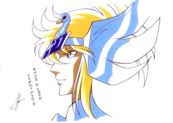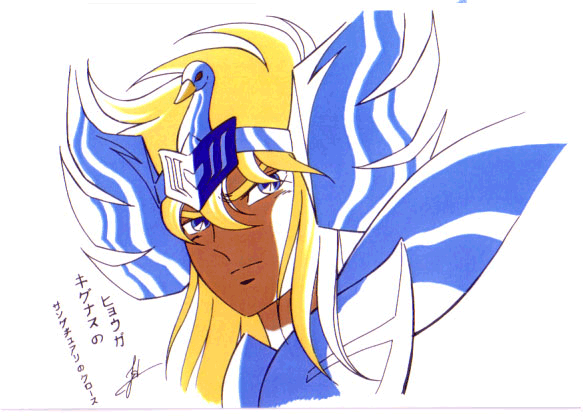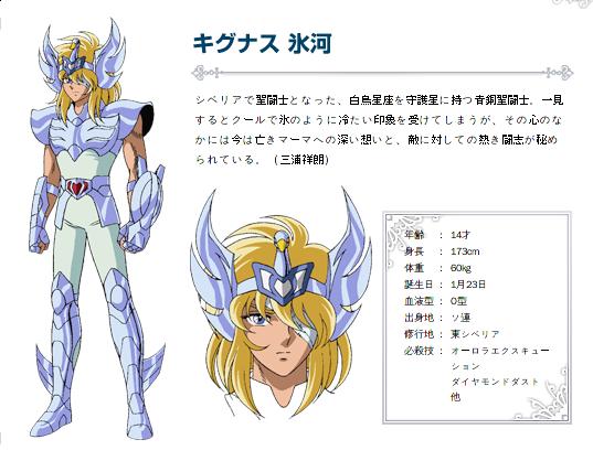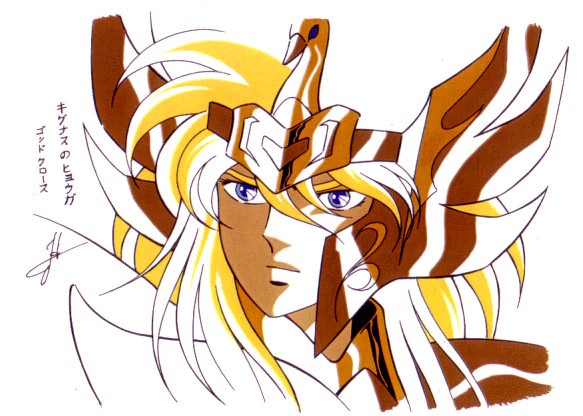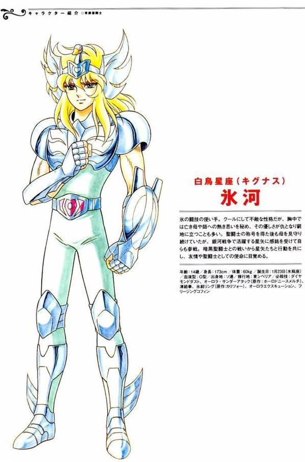 Código cromático del personaje (Bronze Cloth y Cosmos): Azul (como Seiya, pero su armadura tiene un tono azulado más plateado). Hyôga, caballero del Cisne (Hakuchôseiza no Hyôga) 白鳥星座の氷河 pron. jp. [kigunasu no Hyōga], Cygnus Hyōga (白鳥星座 キグナスの氷河), también conocido como Swan Hyōga en varias adaptaciones internacionales, es el Bronze Saint de Cygnus. Hyoga es uno de los cinco Bronze Saints que forman el grupo de héroes de Saint Seiya, fue el tercero de los cinco protagonistas principales en ser introducido. Es ruso-japonés, por ser hijo de Kido y de Nasstassja (Natassia). La ascendencia rusa por su lado materno explica su cabello rubio y sus atractivos ojos azules, aunque con tez bronceada, siendo aquel que tiene más fans entre las chicas. Nació en el pueblo ficticio de Kohoutek, situado al Este de Siberia que, en el momento en que Kurumada escribió y dibujó su manga, estaba en la Unión Soviética. Hyoga es representado como el clásico joven siberiano o del norte: rubio, con ojos azules y una tez clara. Tiene un cuerpo atlético y esbelto y, sobre todo, una mirada fría y sutil, detalles que lo caracterizan como extremadamente ambiguo y hacen que sea difícil entender cuál es su verdadera voluntad o si está diciendo la verdad o no. Esto está bien subrayado en los primeros capítulos del manga. El personaje se viste, principalmente, con una camisa azul sin mangas y pantalones negros con calentadores naranjas a la altura de los muslos. Sin embargo, al usar el Bronze Cloth del Cisne, los pantalones de Hyoga son del mismo color que la camisa y desaparecen los calentadores de piernas. Desde la saga de Poseidón (o desde la saga de Asgard en el anime), Hyoga viste un traje totalmente blanco bajo la armadura del Cisne. Hyoga es presentado en la serie como un chico tranquilo, relajado, frío e impasible. Originalmente parece ser una persona muy valiente y segura de sí misma, pero luego mostrará un lado mucho más frágil, principalmente debido al recuerdo de su madre difunta, por ello es sentimentalmente vulnerable. No es sorprendente que el verdadero objetivo de Hyoga de convertirse en Saint es para ser capaz de romper la gruesa capa de hielo que lo separa del cuerpo congelado de su madre, motivación egoísta que le recrimina su maestro Camus y que su compañero Isaac le criticar y se opone. Hyoga también está dispuesto a suicidarse para llegar a su madre, como ya se puede ver en sus primeras apariciones. A pesar de todo, si bien el recuerdo de la madre lo lleva a ser a menudo nostálgico y muy frágil interiormente, es a partir de la figura de su genitora que Hyoga encuentra la fuerza para luchar. Hyoga logrará progresivamente alejar el recuerdo de su madre gracias a las enseñanzas del maestro Camus, al fuerte sentimiento de amistad que lentamente lo une a sus compañeros y el ideal de defender la justicia. Finalmente, las peculiaridades que siempre han distinguido a este personaje son las constantes batallas contra personas queridas por él (Crystal, Camus y su compañero de entrenamiento Isaak). Estos enfrentamientos, aunque frustrantes psicológicamente para Hyoga, lo han hecho más fuerte, más maduro, lo han apartado de sus recuerdos y lo han hecho cada vez más un noble Saint dedicado a Atenea. En el manga, en la escena donde se hunde la nave donde descansa Natassia, Camus dice que su alumno sufre del complejo de Edipo, pero más tarde, en una versión de volumen, se limita a decir que todavía piensa en su madre. Sin embargo, más allá del del hipotético complejo de Edipo del cual el personaje puede verse afectado, durante la saga de Asgard Hyoga parece muy unido a la princesa Flare mientras que durante la OAV de la diosa de la discordia Eris, el Saint muestra afecto de alguna manera por Irina. En el manga Next Dimension, Hyoga demuestra haber madurado psicológicamente, como lo demuestran los discursos con Shiryu y Gestalt. Hyoga fue entrenado en el frío de Siberia y enviado al torneo Galaxian Wars para matar a todos los Bronze Saints, pero pronto se aliará a la causa de Seiya y sus amigos, jurando fidelidad a la verdadera Atenea. Aparece por primera vez en la serie cuando recibe una orden del Santuario para eliminar a sus compañeros Bronze Saints, pero rápidamente abandona esta misión al constatar la enorme fuerza voluntad que guía a Shiryu y Seiya durante su combate en el torneo Galaxian Wars y cuando descubre la verdad sobre la identidad de Saori Kido, entonces se une a ella en las batallas contra sus enemigos. En el manga Hyoga no decidió participar en el torneo Galaxian Wars organizado por la Fundación Graude hasta que recibió una orden para ir a asesinar a los demás Bronze Saints, una carta del Santuario le dio precisiones sobre la ubicación de la armadura del Cisne, y le dio instrucciones para matar a todos los Bronze Saints que combatían en el Torneo Intergaláctico por sus propios intereses, lo cual es una violación de las reglas de la orden de Saints. Hyoga aceptó la misión debido a su odio por la Fundación Graude, siendo consciente de que Mitsumasa Kido era su padre. A medida que se familiarizó con los demás Bronze Saints, Hyoga se volvió indeciso acerca de su misión, puso en duda rápidamente el fundamento de esta cuando vio como Seiya salvaba la vida a Shiryu. Una vez que los Silver Saints comenzaron a atacarlo junto con los otros Bronze Saints, abandonó su lealtad al Santuario, se alia con ellos y también se convierte en un traidor. Su rabia hacia el Santuario aumentó después de que su maestro Camus hiciera una visita inesperada a Siberia para enviar el barco de su madre a las profundidades de un abismo en el océano. En el anime es Ikki quien es enviado por el Santuario a eliminar a los Bronze Saints y a recuperar el Gold Cloth de Sagitario, pero pronto decide luchar por sus propios intereses. En el anime, los Bronze Saints son huérfanos, no son todos hijos de Mitsumasa Kido. En la te