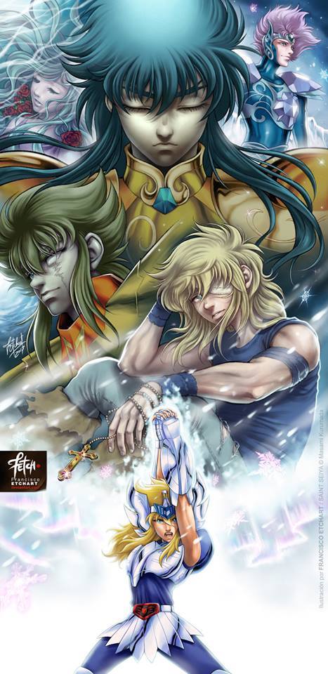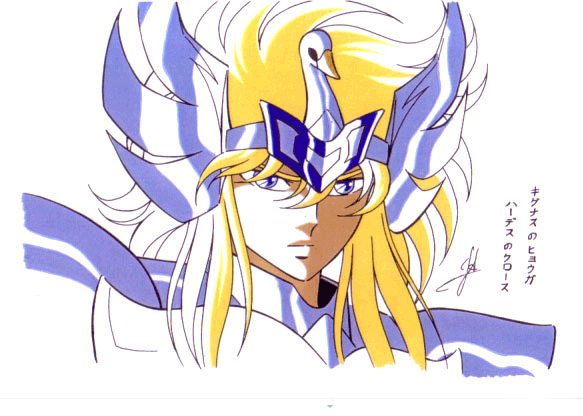 Fanart de NiiiiLink (Francia) Saga de Hades : En la Saga de Hades es interrumpido por Misty, Babel y Moses en Siberia. Al parecer, los Santos de plata muerto fueron resucitados por Hades. Pero Hyōga los derrotada muy fácilmente. En los doce Templos colabora para detener al impacto de las dos Exclamaciones de Athena. Y luego hace que evoluciones su Armadura gracias a la sangre de Athena la cual también hace que los Santos de Bronce despierten su Octavo Sentido. En el Inframundo le pagan a Carón para cruzar el río Aquerón y luego derrota a Iwan en el camino a Giudecca. En el Estanque de la Oscuridad es vencido por Flegias. Pero éste es derrotado por Kanon. Luego Hyō´ga y Shiryū son los últimos en llegar a Giudecca. Cuando los Santos dorados logran destruir el Muro de los Lamentos y los Santos de bronce se abren camino hacia la Hipermidimensión, Hyōga se enfrenta al más fuerte de los Espectro, Minos. Viendose en despeventaja no sabe como derrotarlo pero el Líder de los Espectros se mete en la Hiperdimensión la cual lo desintegra. En ese momento la armadura del Cisne vuelve a evolucioanar creciendoles alas.