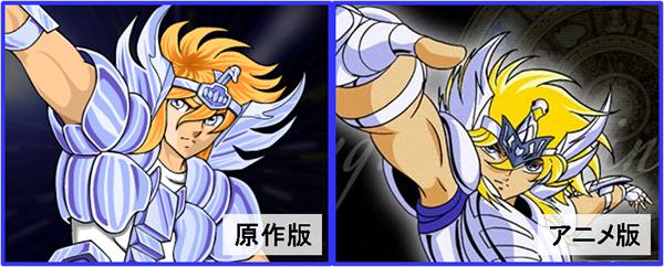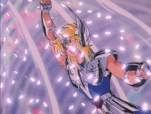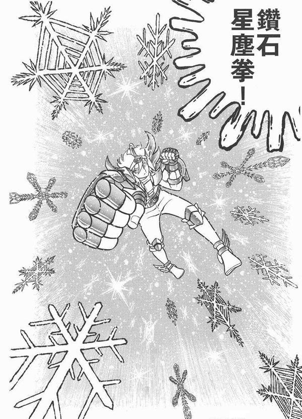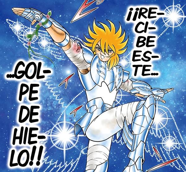 con el nombre del ataque: No es de extrañar que Hyoga tenga que gritar para decirle al público qué ataque está usando... (los tres ataques con dos manos son prácticamente idénticos en su ejecución). Lo curioso es notar que la pose de dos manos aparece primero en el anime, luego Kurumada lo añadió a su manga. Por otro lado, la hermosa danza del Cisne es una creación del anime, aparece por primera vez cuando Hyoga combate con el Cisne negro. No obstante, en el manga Kurumada no la introduce hasta el combate entre Hyoga y Milo en el templo de Escorpión. La coreografía es evidentemente mejor y más desarrollada en el anime debido a las limitaciones de las viñetas del manga. La primera vez que Hyouga realiza el Diamond Dust en el manga su pose es casi la misma que Seiya cuando realiza su Pegasus RyuuSeiKen, mantiene uno de sus brazos extendido y su puño apretado. La escena en el anime es idéntica al panel del manga dibujado por Kurumada. Luego, en el anime, la pose de un solo puño de Hyouga es abandonada / descartada en favor de la pose de dos manos... parece que a Kurumada le gustó más que la que él creó y la añadió a su manga posteriormente. En cuanto a los movimientos de Hyoga,
