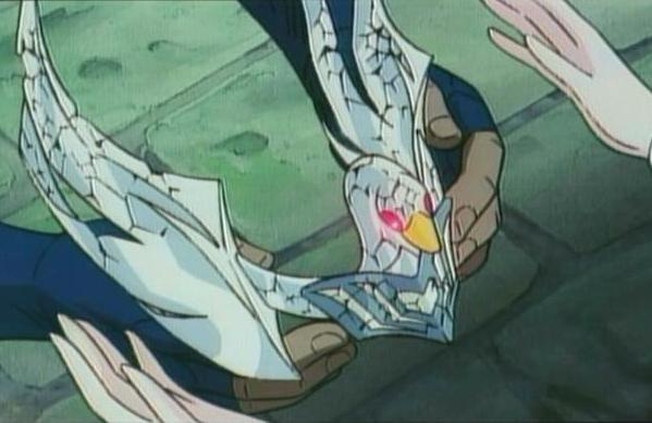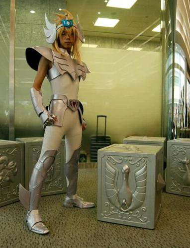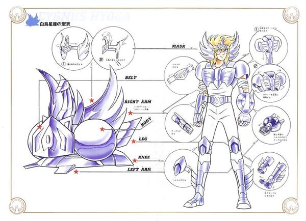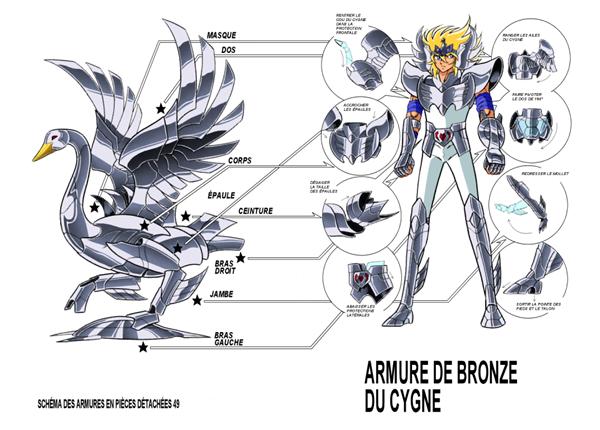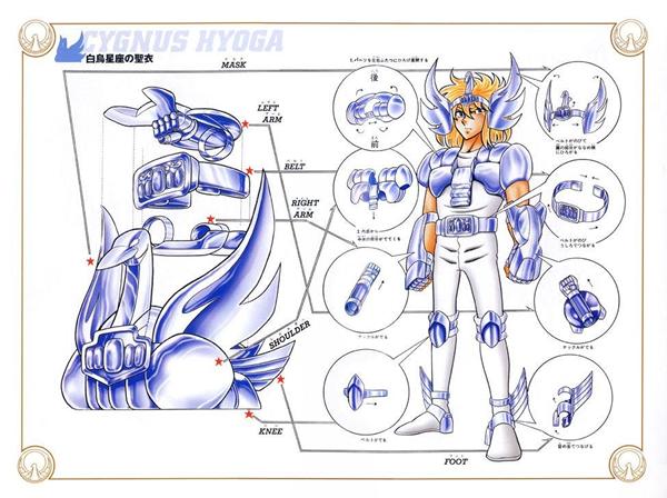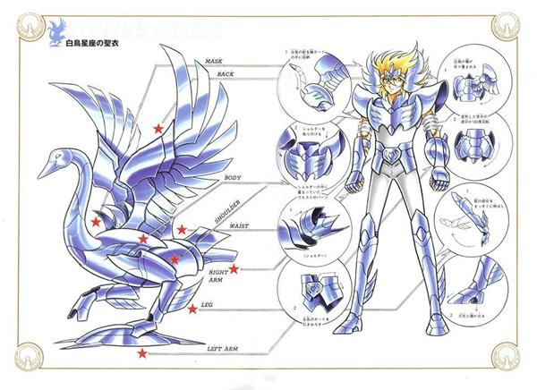 Cygnus no Cloth. キグナスのクロス (Kigunasu no Kurosu) “La Armadura del Cisne”. El personaje mitológico representado es Zeus, que se transformó en cisne para seducir y poseer a Leda, reina de Esparta. El Cygnus Cloth fue creado en la era de los mitos, al igual que el resto de Cloths. Se dice que llevaba siglos encerrada en el glaciar de Siberia, desde que fue usado por última vez (desde 1747 hasta 1990 son 243 años). Hyouga dice que el Santuario le indicó en una carta donde podía encontralo, lo que quiere decir que eran conscientes de donde se encontraba la armadura. Es probable que en algunos siglos intermedios no haya habido Cygnus Saint, porque casi nunca se han juntado los 88 Saints. Se da a entender que Hyoga es el primero en utilizar el Bronze Cloth de Cygnus en 10.000 años, ya que la armadura fue ocultada previamente dentro de un iceberg antes de Hyoga la recuperara. La armadura del Cisne es un vestigio de la 4ª glaciación, permaneció hundida y oculta en un enorme glaciar de hielos eternos que no se fundió durante milenios en Siberia. Su superfície es fría como el hielo lo que otorga una mejor protección ante golpes basados en corrientes de aire frío que las demás armaduras de Bronce. La armadura de bronce del Cisne resultó dañada varias veces en el transcurso de la historia, siendo Mū de Aries el responsable de repararla. En el manga, la armadura cambia de forma cada vez que es reparada, adquiere una forma más elegante y protege una mayor parte porcentual del cuerpo. Es así que Hyôga llevará hasta 4 armaduras del Cisne diferentes, que evolucionan durante la serie. La armadura original es la que Hyôga liberó de los hielos eternos y recibió tras su formación. La segunda armadura evoluciona tras ser reparada por Mu después de que Milo derramara su sangre para revivirla al final de la batalla de las 12 casas. La tercera armadura evoluciona tras recibir la sangre de Atenea en la saga de Hades, y finalmente, la última es la God Cloth del Cisne. Ni en el manga ni en el anime se atribuye un poder especial a la armadura del Cisne, a no ser una resistencia al frío superior a la media fruto de su encierro en los hielos eternos. El Taizen argumenta que este Cloth es tan gélida como el hielo y por ello sólo puede ser endosada por un Saint que domine la energía fría y esté habituado a temperaturas muy bajas, por ese motivo debe ser capaz de intensificar los ataques glaciales. Si bien no es tan duradera como el escudo del Dragon Cloth, ni dispone de capacidades regenerativas como el Phoenix Cloth, el Cygnus Cloth es venerada como una de las mejores armaduras de bronce. Habiendo sido encerrada en un bloque de hielo durante muchos años, absorbió de forma natural las propiedades árticas de su entorno. Por lo tanto, se hace difícil romper sus corazas completamente. Phoenix Ikki comenta que también sufrió un efecto de "congelación", cuando peleó contra Hyoga y provocó un agujero con su puño en el protector del pecho de su armadura, en ese momento sintió como su muñeca derecha se congeló.