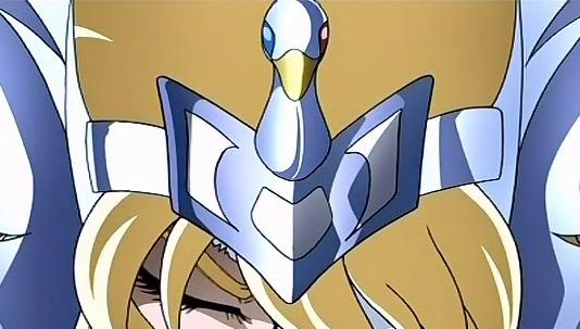 El casco diadema consta de 2 piezas en forma de alas de cisne en los costados y una pieza principal en el centro que representa el cuello y la cabeza de un cisne. Las hombreras son simples, cubren parcialmente los brazos, son en forma de U y rodean el hombro, en el proceso de endosamiento se aprecia que no están unidas al bloque central, formado por dos piezas metálicas ligeramente cóncavas, que cubre el pecho y la espalda, sólo se apoyan encima. El pectoral también es simple y protege gran parte del pecho, consta de una pieza central que cubre parte del abdomen. La coraza del brazo izquierdo incluye un escudo que incluye dos piezas sobresalientes que le dan una forma particular doble, rectangular y oval, el protector del brazo derecho es simple y cuadrado. A diferencia del manga incluye una falda y corazas que cubren totalmente rodillas, piernas y pies. El cinturón luce una tabla o hebilla negra con bordes y decoraciones rojas. Las rodilleras son romboides. Dispone de protectores en los tobillos con 2 alas en los costados.