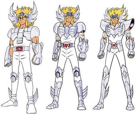 TELESERIE ANIME (4) Cloth 聖衣 I / Early Cloth (anime) A diferencia de Seiya y Shiryu, tanto Hyoga como Shun e Ikki cuentan únicamente con 3 versiones de Bronze Cloth, más un God Cloth, lo que hace menos complicado analizar su evolución a través de las sagas. Seiya y Shiryu cuentan con versiones suplementarias debido a que sus Bronze Cloth originales fueron destrozadas en el torneo Galaxian Wars y requirieron una reparación extra de Mu en Jamir al principio del manga, sufriendo mutaciones antes que las demás. Fanarts de Trident y Warlock of Design (Francia) ANIME : En el anime, el diseño original de las armaduras V1 permanece intacto hasta el inicio de la segunda temporada de la serie, durante toda la Saga del Santuario (combates contra los Black Saints, Silver Saints y Gold Saints), hasta el inicio de la saga de Asgard, segunda temporada de la serie, entonces varía su forma inicial.