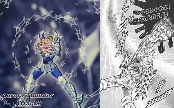 En el manga cuando Hyouga golpeó a Milo ejecuta el Kholodnyi Smerch (en ruso, “Tornado Glacial” - Cold Tornado) mediante un gancho con el brazo derecho, con el que propulsa a su víctima por los aires en un torbellino de hielo (aunque en el manga Next Dimension Mystoria de Acuario lo hace con los brazos y palmas alzadas). Paradójicamente, en el anime Hyoga atacó a Milo en su templo de Escorpión con una pose similar y lo lanzó por los aires, aunque sin pronunciar el nombre del ataque, la escena es idéntica a la viñeta del manga dibujada por Kurumada, pero Hyouga dice Aurora Thunder Attack en vez de Kholodnyi Smerch. Es la única vez que parece que Hyoga ejecuta el Kholodnyi Smerch en el anime. El Aurora Thunder Attack fue simplemente utilizado en el anime, porque es más fácil para el japonés pronunciar este nombre en inglés que el nombre del otro ataque en ruso. El cambio no era realmente necesario, pero cosas así suceden a menudo en la adaptación de un manga a anime, podrían haber cambiado el nombre y dejar el ataque intacto. El nombre se cambió para facilitar la lectura y comprensión entre los japoneses. Es una palabra demasiado complicada para utilizar en un medio masivo. En un cómic, aunque tambien es un medio masivo, no importa demasiado, porque es leído. Pero ya en un medio donde hay sonido, la cosa cambia. Pudieron haberlo dejado igual al manga, pero pues es claro que se debió debido a la dificultad de su pronunciación. Aunque igual, Aurora Thunder Attack es en inglés y no es un nombre sencillito, está en un idioma muchísimo más familiar que el ruso. Para un japonés, oír Khorodnyi Smerch es sólo como oir un montón de sílabas sin mucho de donde discernir un significado, mientras que si oyen Aurora Thunder Attack, pueden con mucha más facilidad entender de que se trata... es lo mismo para nosotros en este caso.