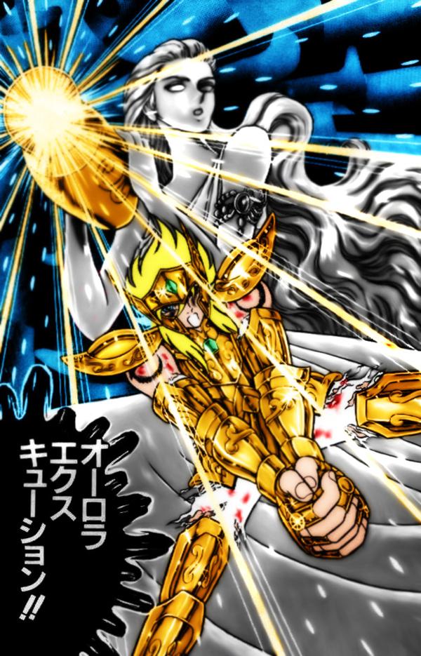 Aurora Execution no Kamae. オーロラエクスキューションの構え - (オーロラエクスキューションのかまえ) “La Postura de la Ejecución Aurora”. Es una postura particular que realiza Camus y luego Hyōga. Consta en levantar los brazos y juntarlos como si fuera un ruego. Si lo hace el Santo de Acuario la armadura forma un cántaro entre los brazos. Según la mitología griega, el ánfora que aparece durante la ejecución representa el recipiente que contenía la fuente de la vida sostenido por Deucalion. De hecho, cuando Camus y Hyôga bajan los brazos vacían sobre su rival el agua de vida representado por su cosmos llevado a su paroxismo. En el manga Saint Seiya ~ The Lost Canvas, Degel de Acuario usa esta técnica contra Radamanthys de Wyvern y Pandora, pero como Minos, el Specter Juez recibe pocos daños y evita el soplo volando.